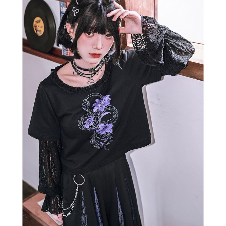 関連キーワード: #チャイナ #中華風 #サブカル #地雷系 #パンク #ゴシック #ストリート #Tシャツ #レイヤード #フェイクツーピース #レース #シースルー #蛇 #スネーク #プリント #クロップド丈 #ショート丈 #黒 #ブラック #パープル #参戦服 #甘辛ミックス