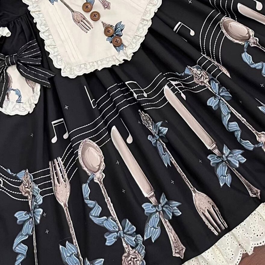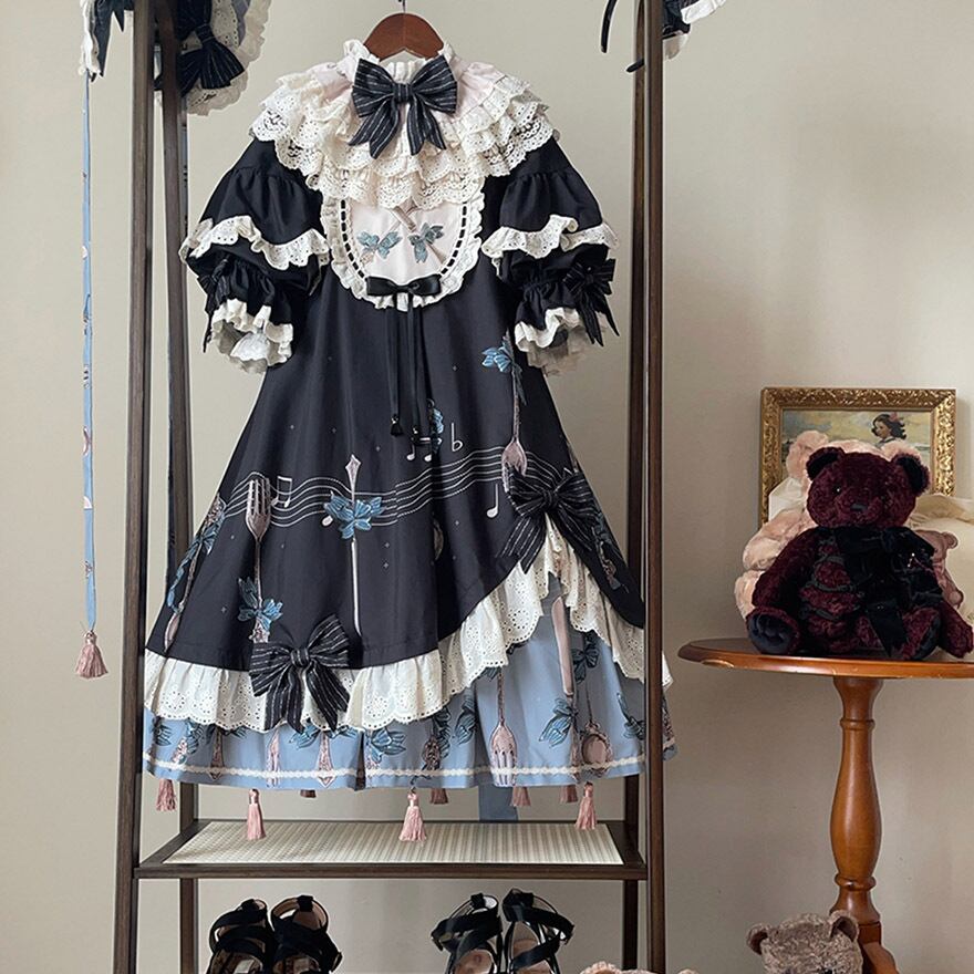 深いネイビーを基調とした生地に、音符や蝶が舞う幻想的なプリントが施されたロリータワンピースです。