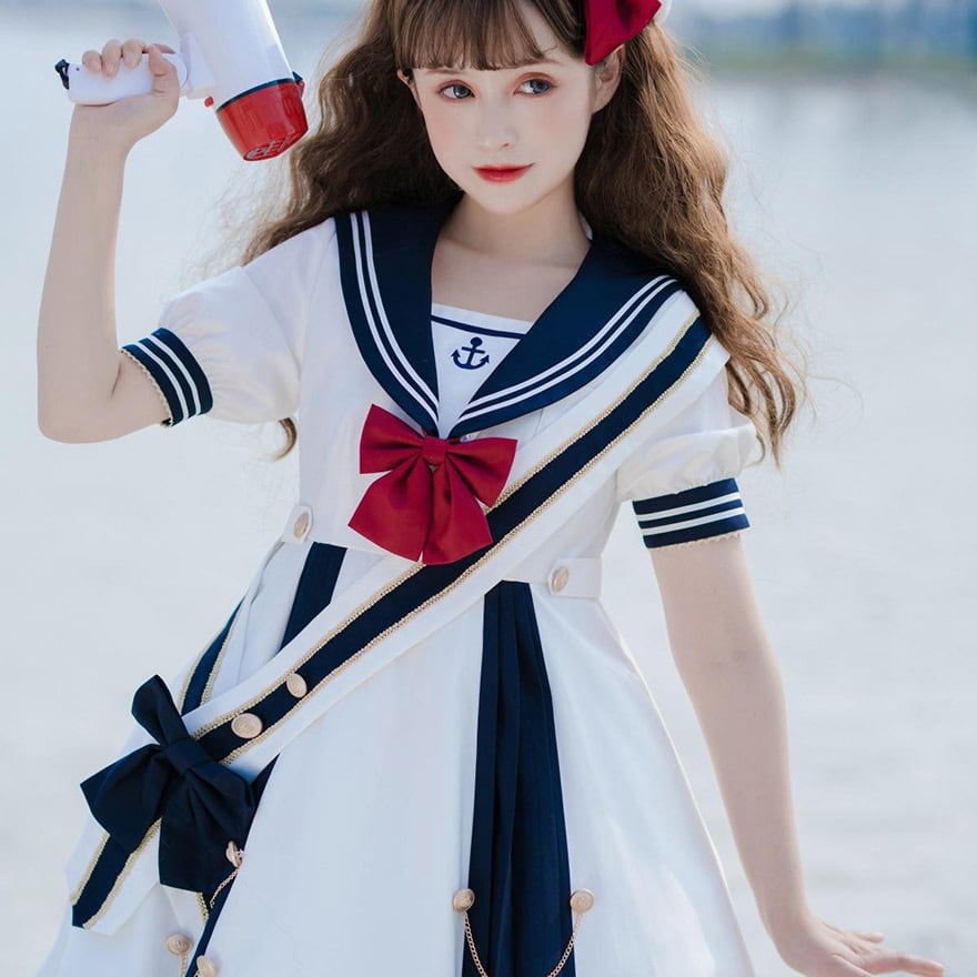 大きなセーラーカラーにはイカリの刺繍が施され、胸元の大きな赤いリボンがキュートなアクセントになっています。