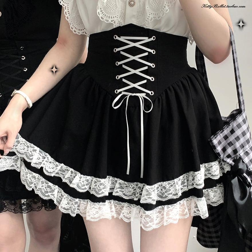 ハイウエストのコルセット風デザインが目を惹く、地雷系・ゴスロリファッションに欠かせないミニスカートです。