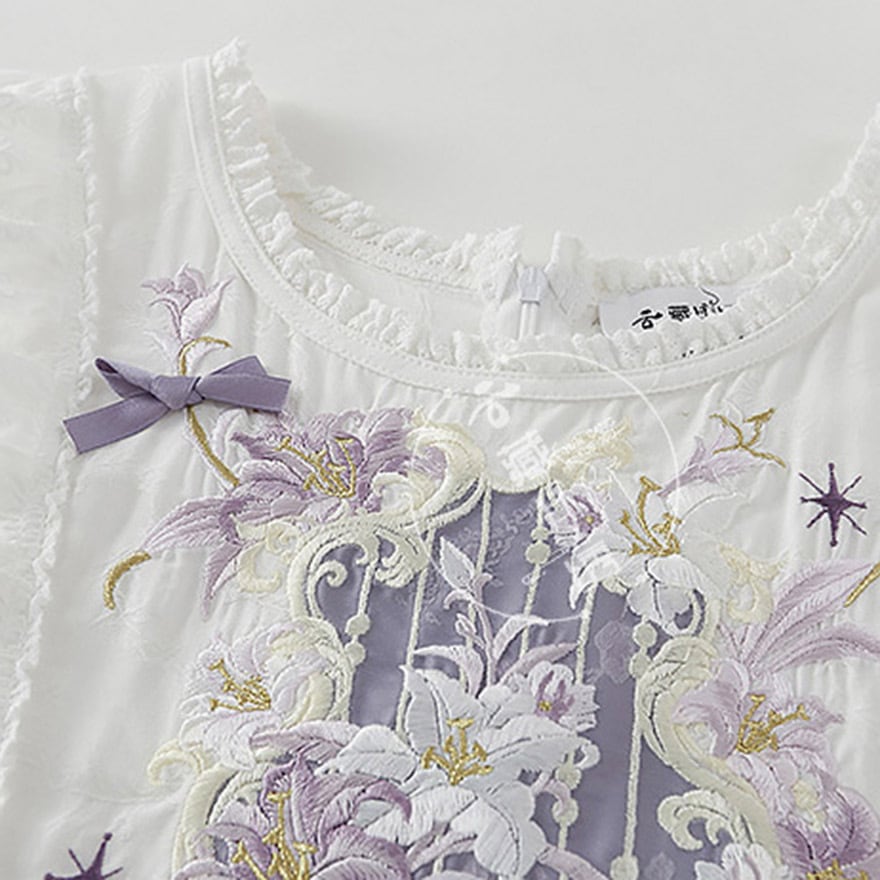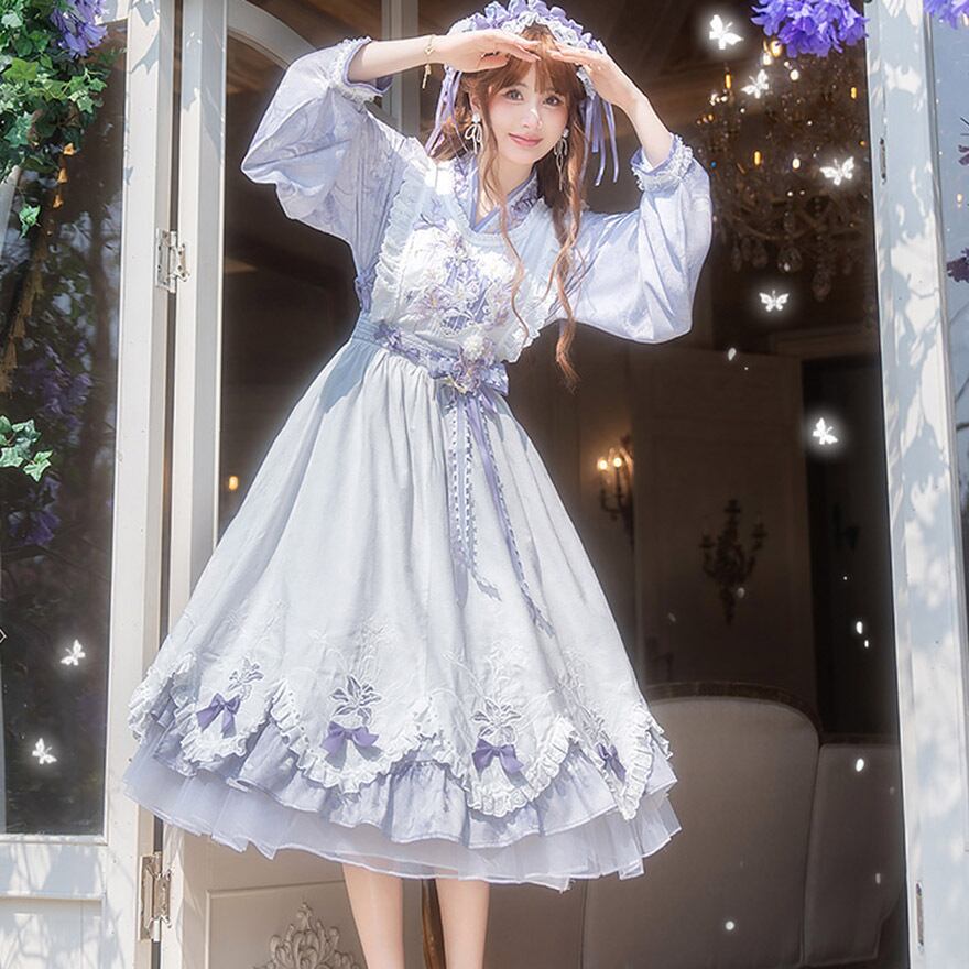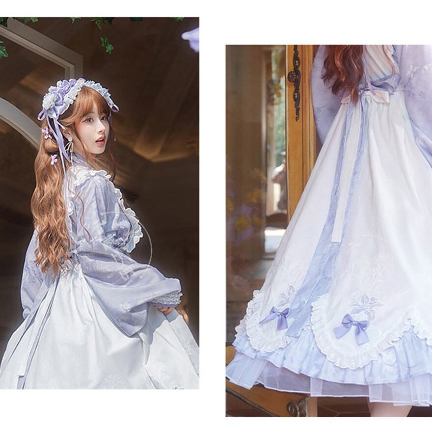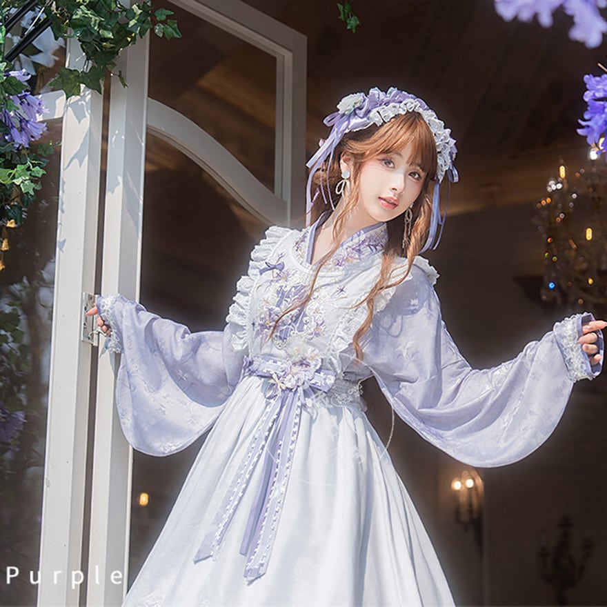 関連キーワード: #ロリィタ #クラロリ #華ロリ #ワンピース #中華風 #メイド服 #刺繍 #レース #パープル #藤色 #幻想的 #お嬢様 #3点セット #サブカル