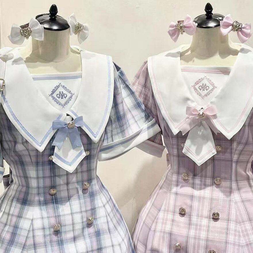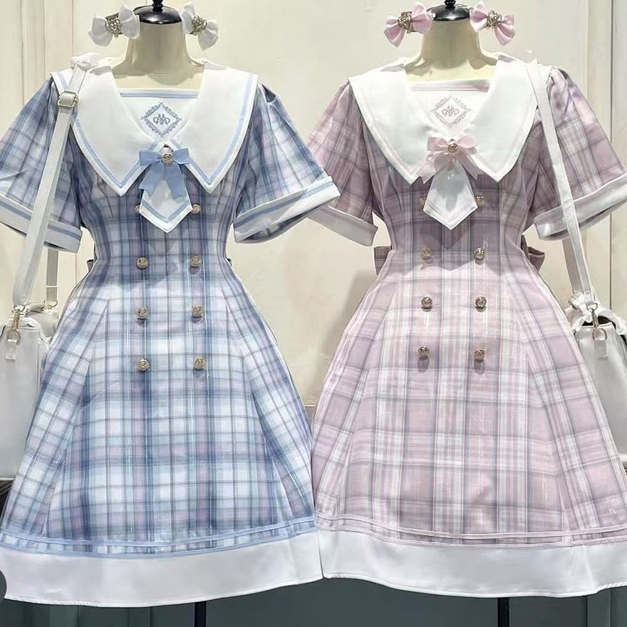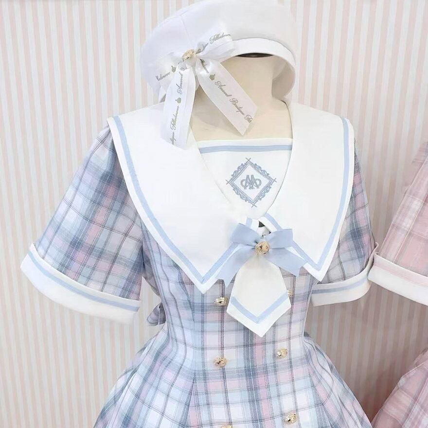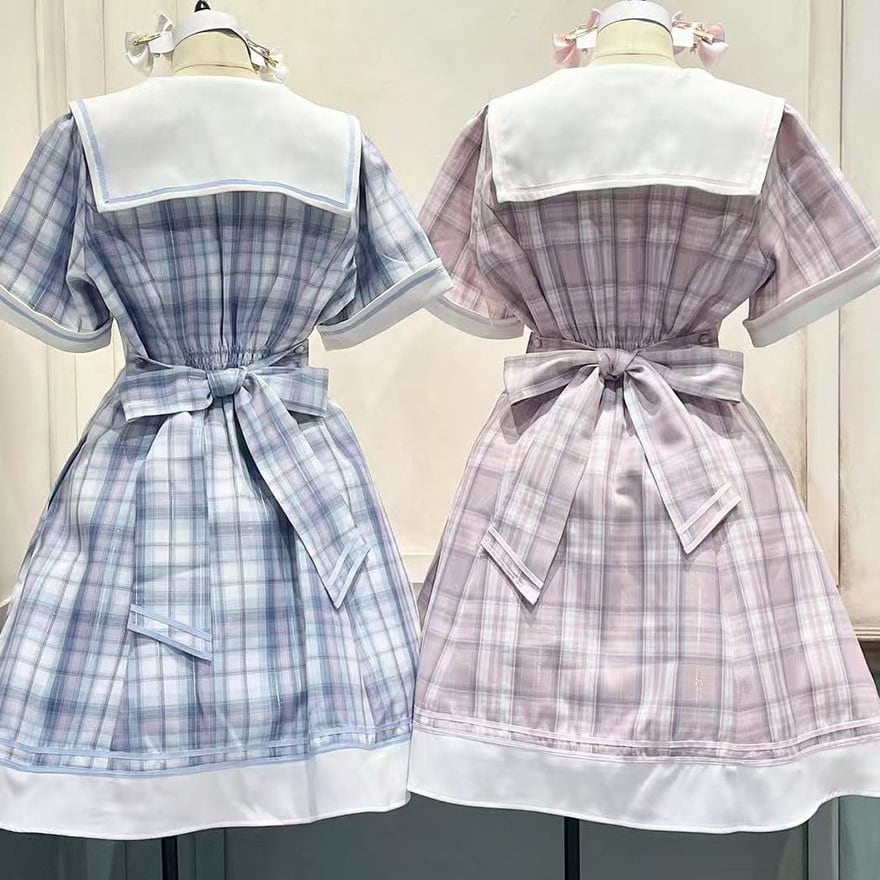 パステルカラーの優しいチェック柄が目を惹く、セーラー服デザインのロリィタワンピースです。