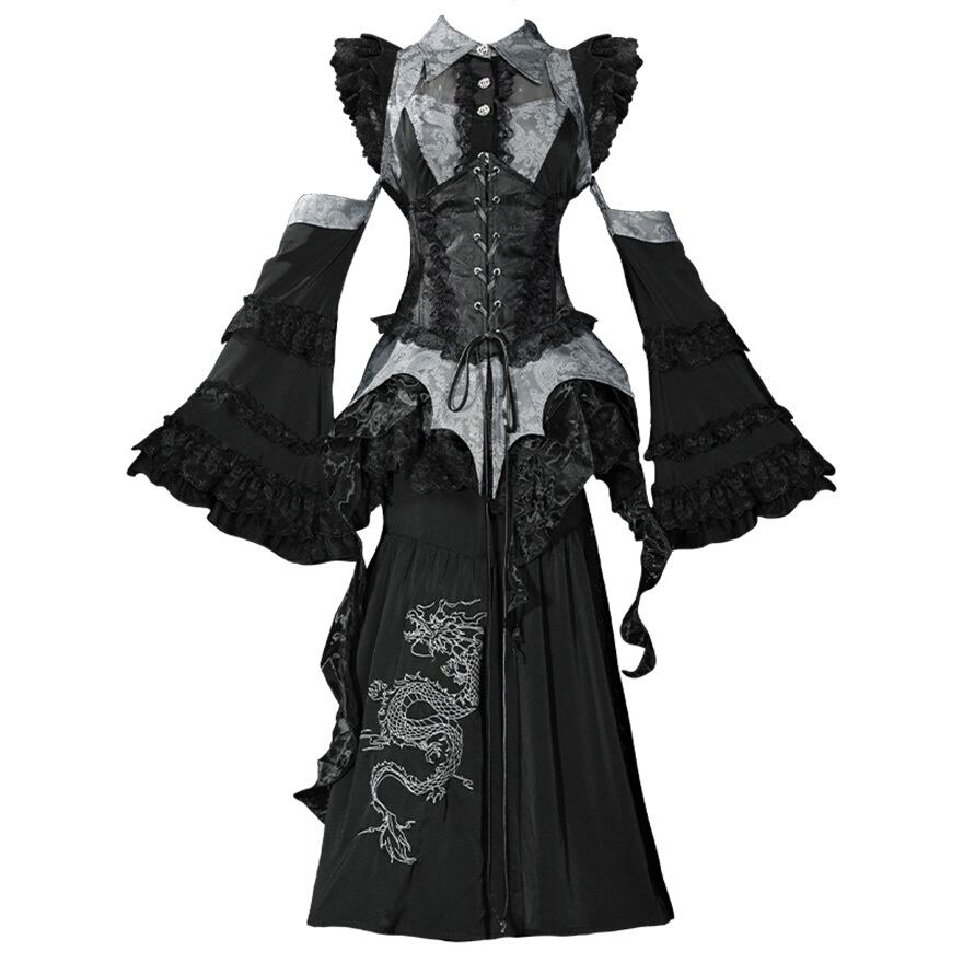 セット内容は、コルセット風トップス、アームカバー、ロングスカートの豪華3点。トップスは、美しいジャガード生地とレースアップが特徴で、大胆に肩を見せるデザインと優雅な姫袖が、妖艶な雰囲気を醸し出します。