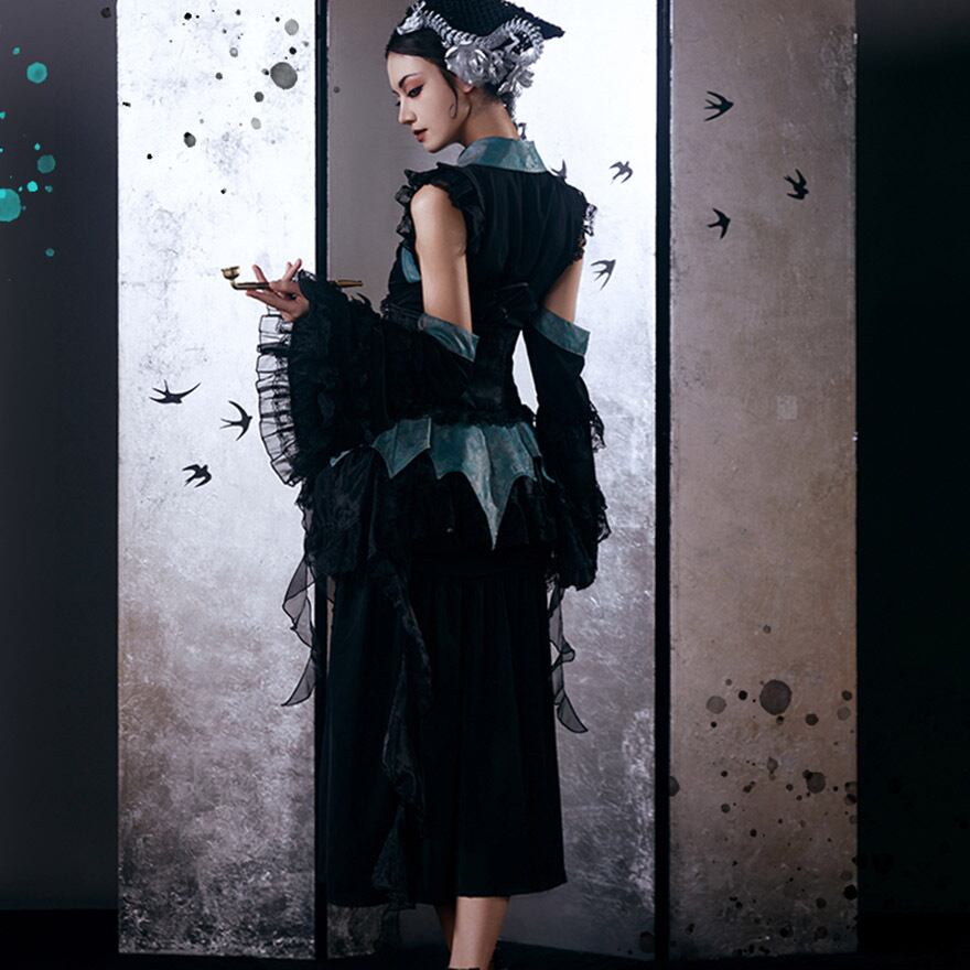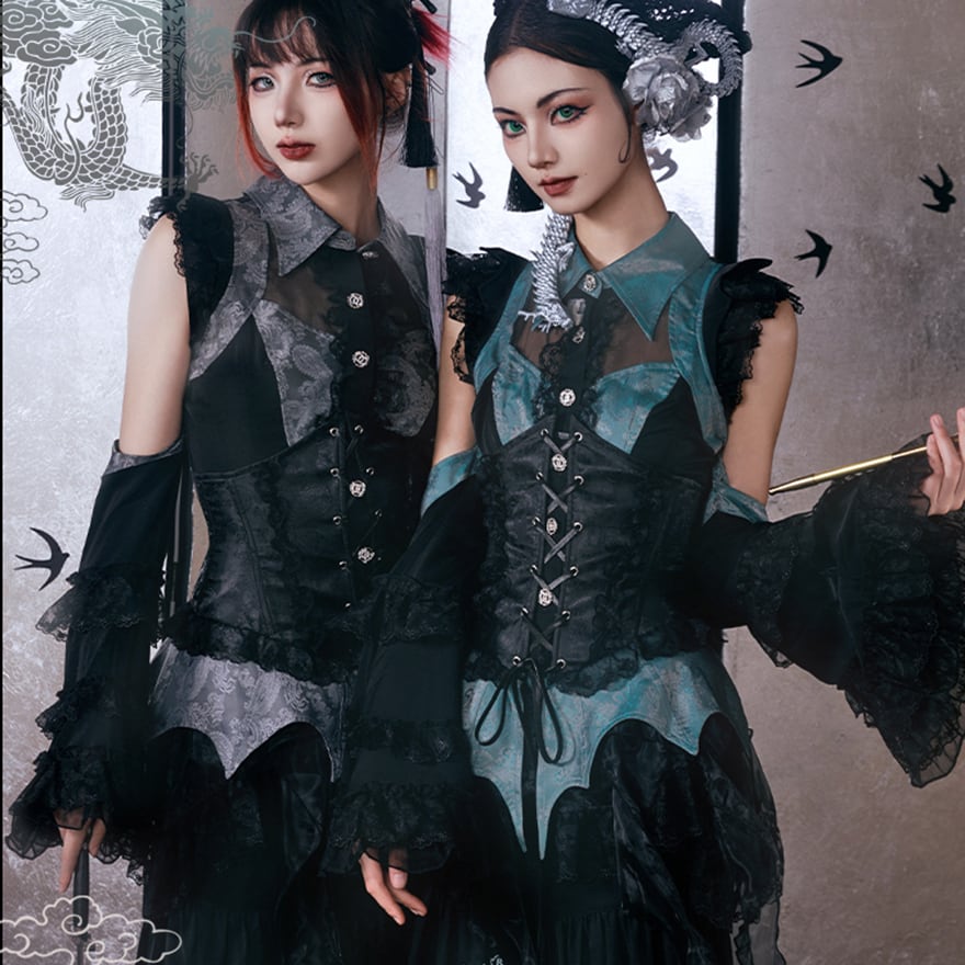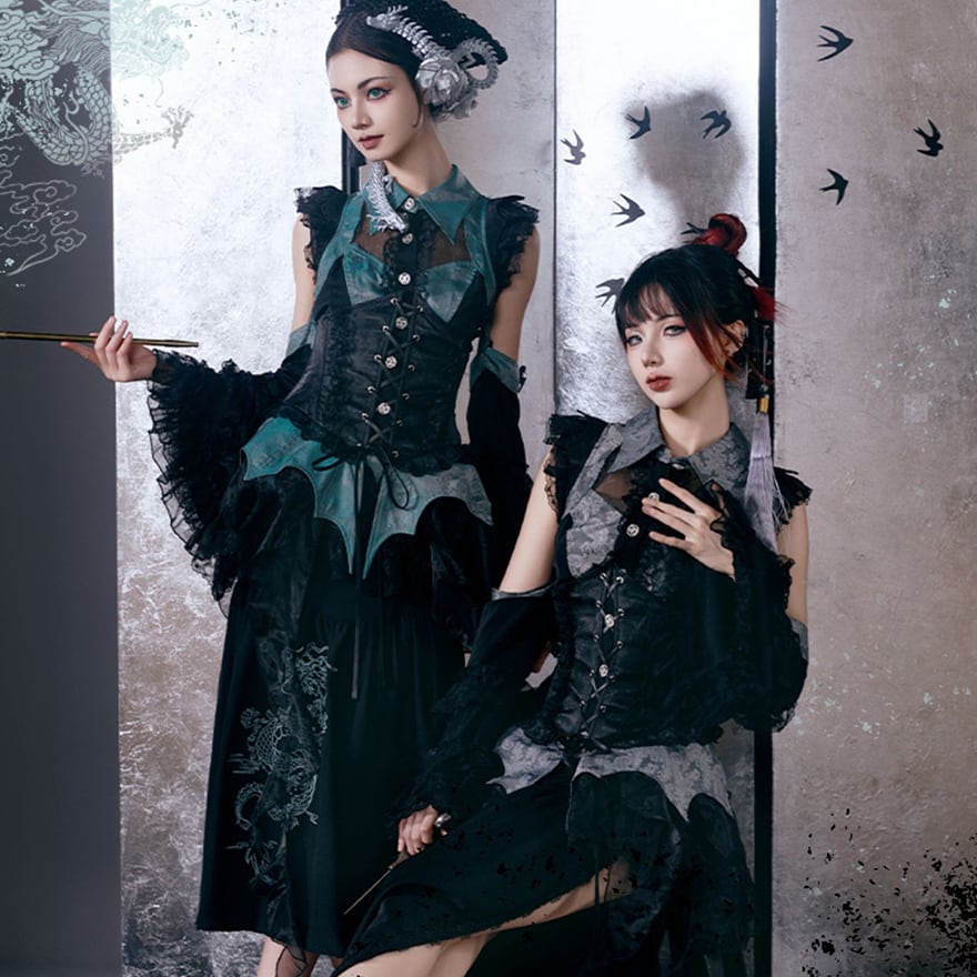 西洋のゴシック様式と東洋の神秘的な美しさが融合した、唯一無二の中華風ゴスロリドレスセットです。