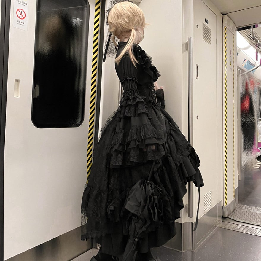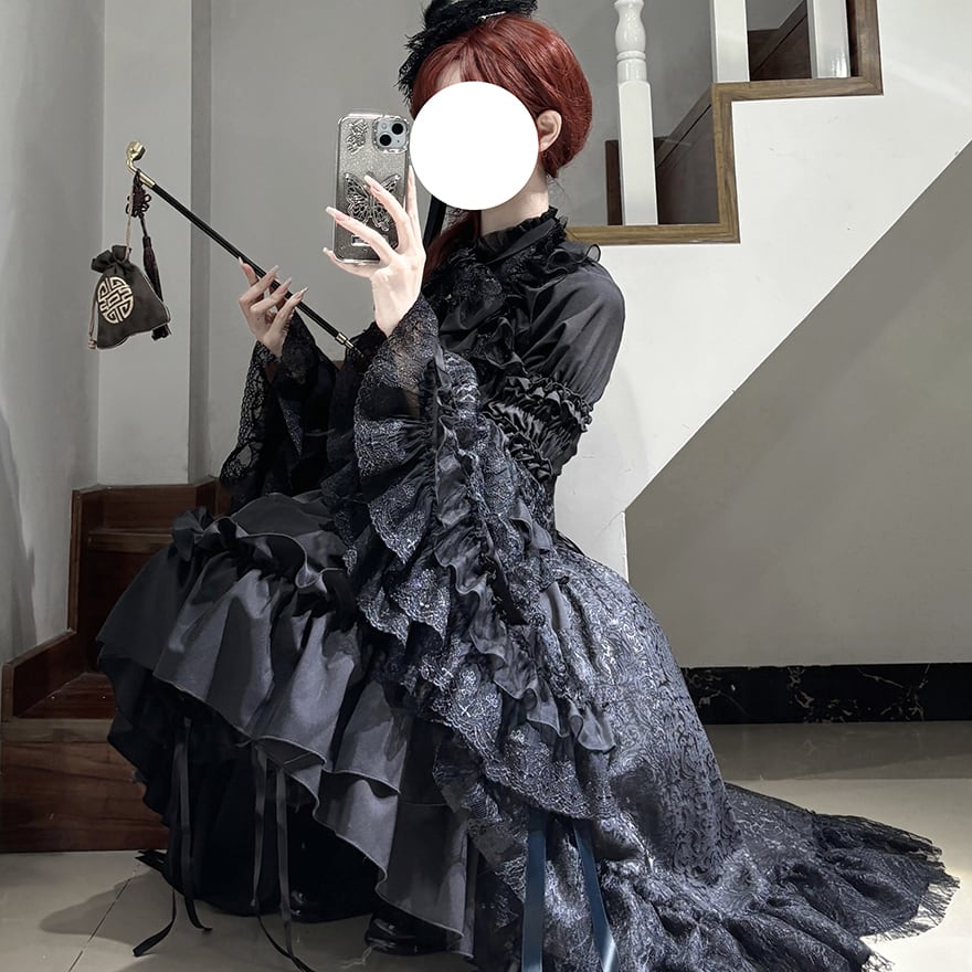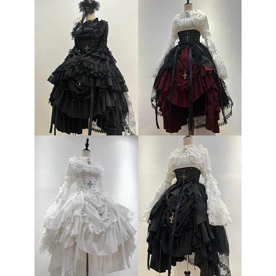 ブラウス、幾重にもフリルが重なるスカートが一体となった、豪華絢爛なゴシックドレスのセットアップです。
