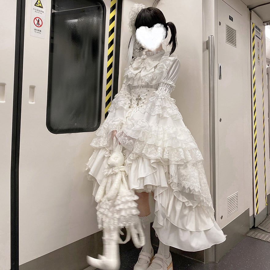 優雅な姫袖、ウエストをきゅっと絞る編み上げのビスチェ、そして前が短く後ろに長く引くドラマティックなフィッシュテールスカートが、完璧なお人形のようなシルエットを創り出します。胸元で揺れる十字架のペンダントと、付属の蝶ネクタイが、より一層世界観を深めます。