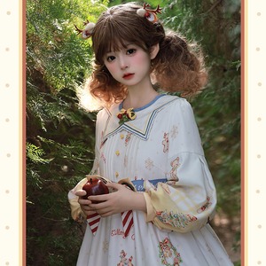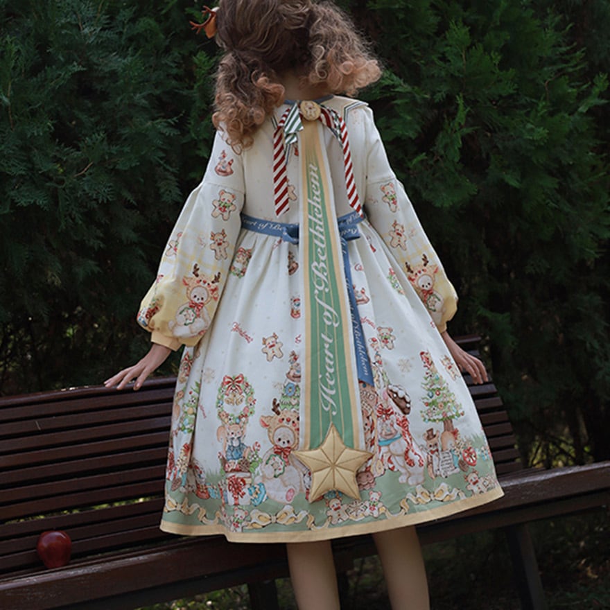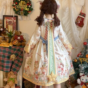 クリーム色の生地に、クリスマスを楽しむくまちゃん達のプリントがぎっしりと描かれた、甘ロリのワンピースです。