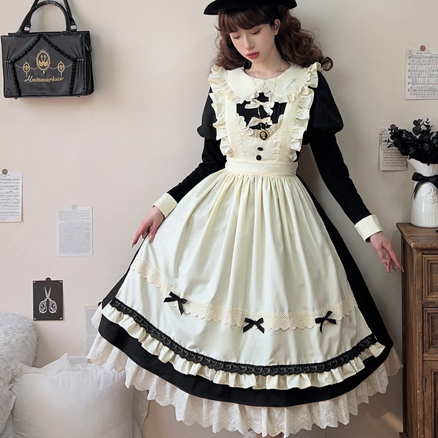 胸元のフリルやリボン、エプロンにあしらわれた繊細なレースと小さなリボンが、隅々までこだわりを感じさせます。