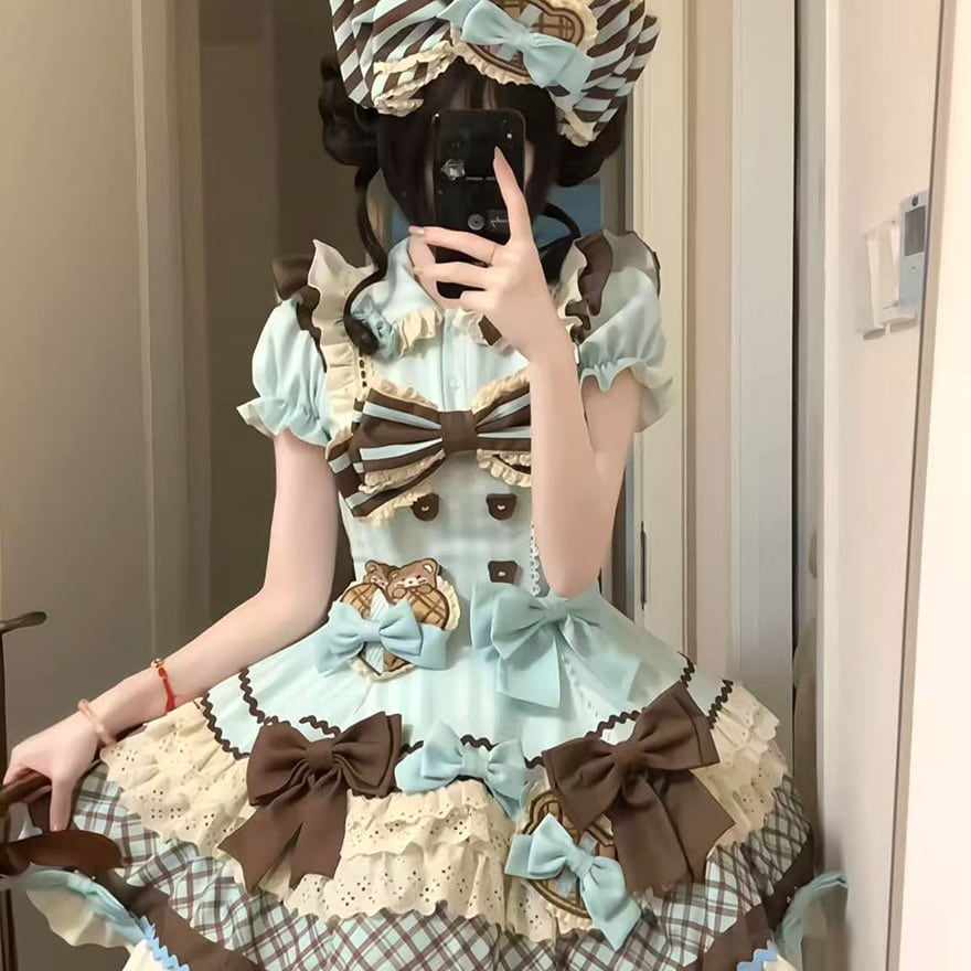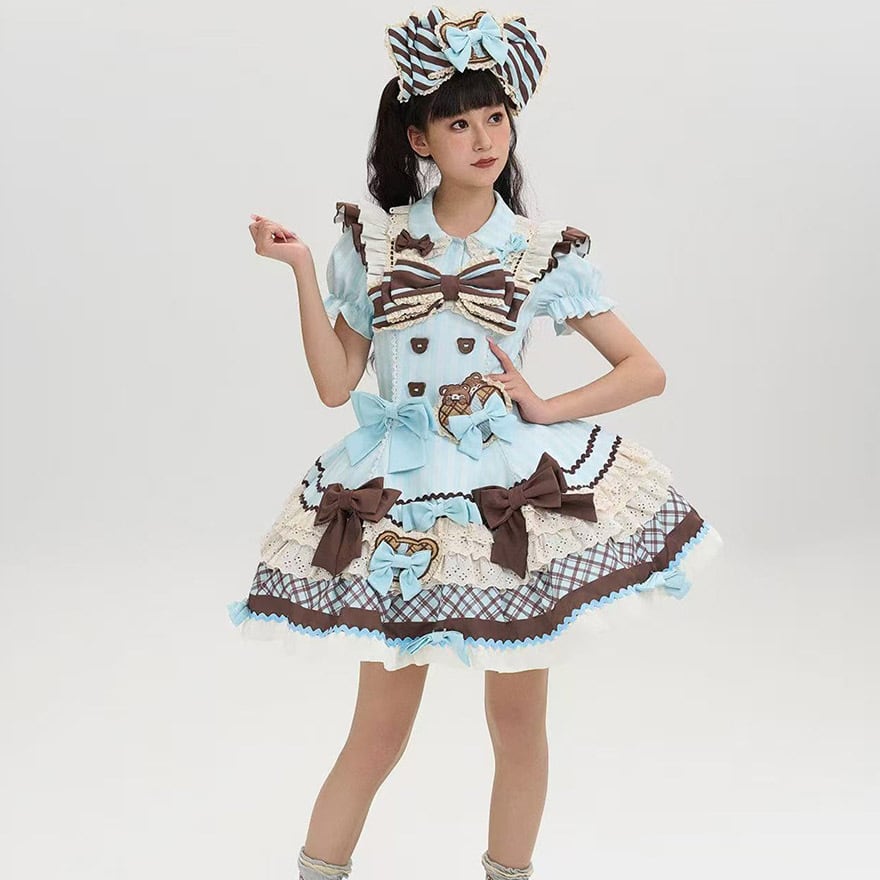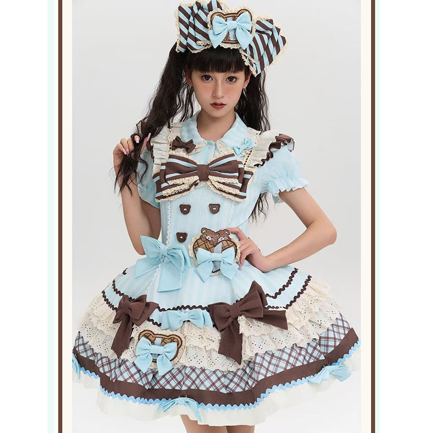 中央にはクッキーのようなベアモチーフが付いた水色のリボンが飾られており、まるでお菓子のような可愛らしい世界観を演出します。