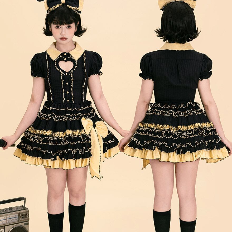ブラックを基調に、胸元のハートのくり抜きがキュートなアクセントになったセットアップです。