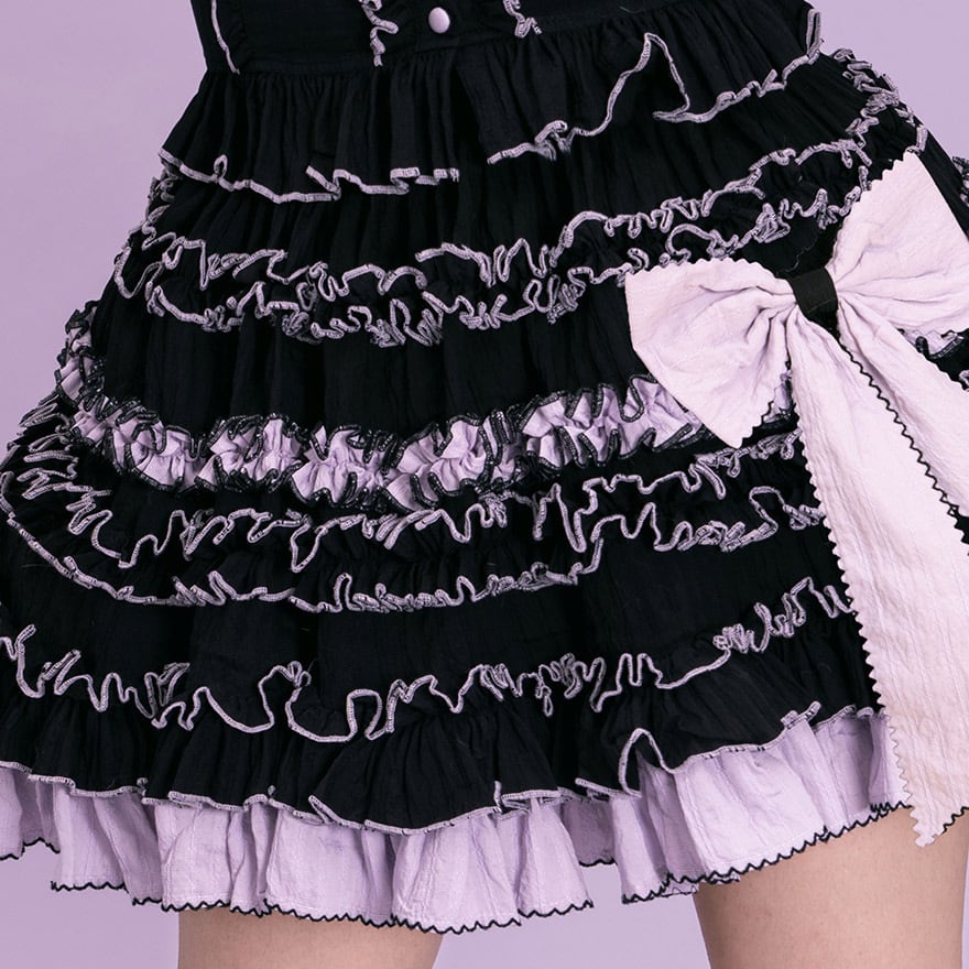 差し色の効いた襟やフリルが、ダークな中にも可愛らしさをプラス。