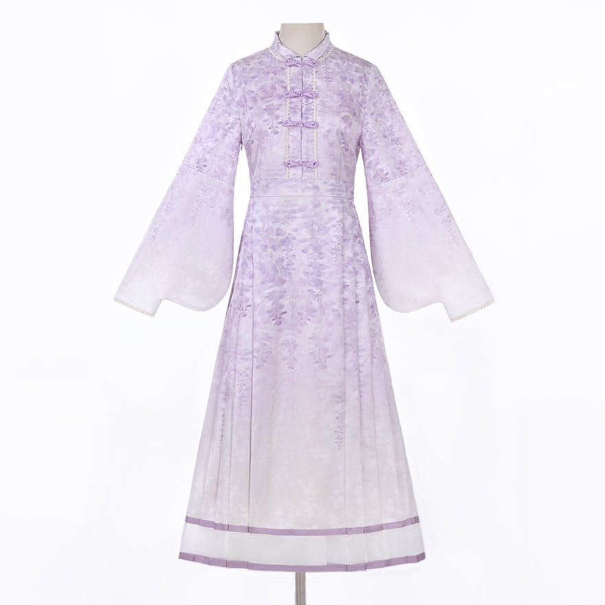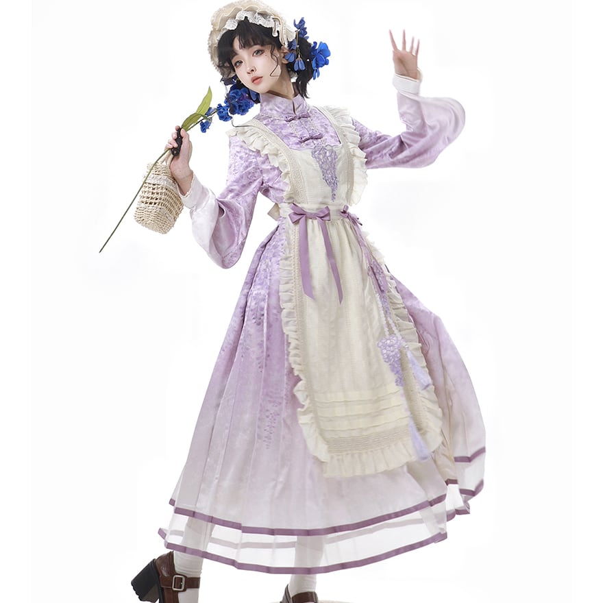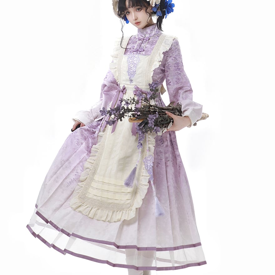 淡いラベンダーのグラデーションが美しい、ロング丈のワンピースとエプロンのセットです。