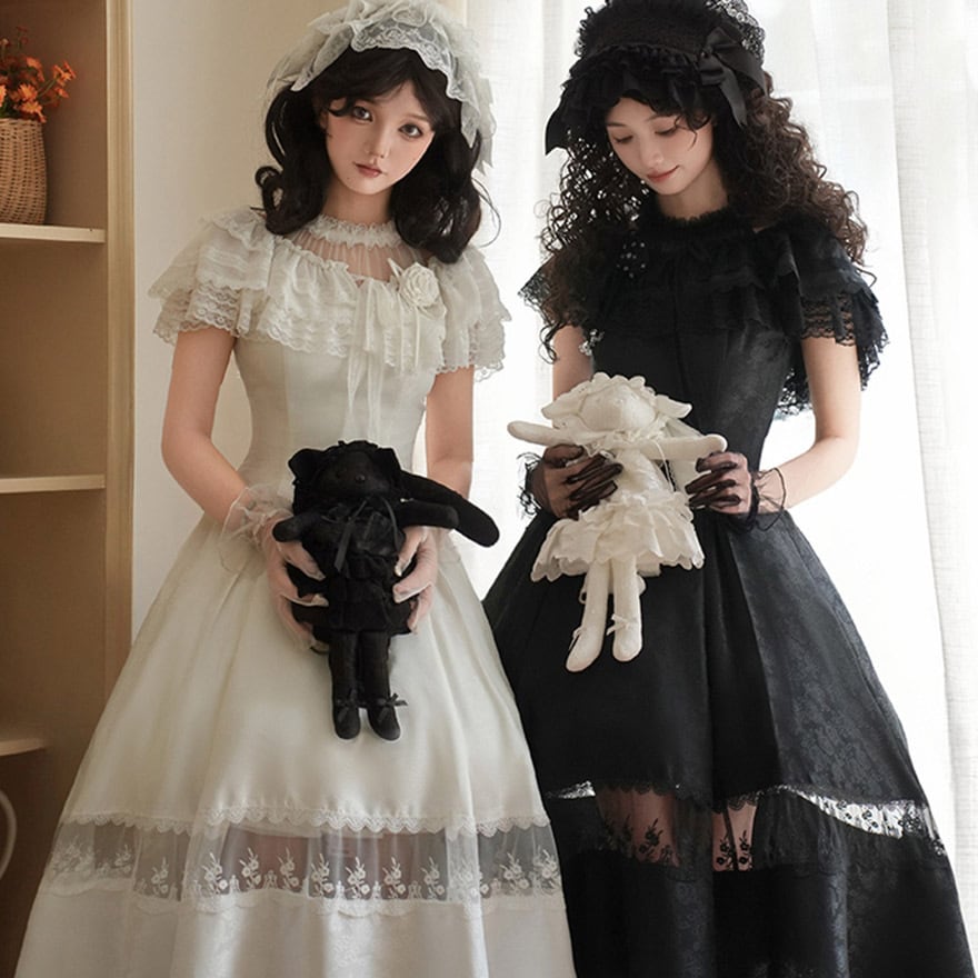 この一着でコーディネートが完成する、ワンピース、ケープ、胸飾り、ヘッドドレスの豪華4点セット。漆黒が美しいブラックと、儚げで清楚なホワイトの2色からお選びいただけます。