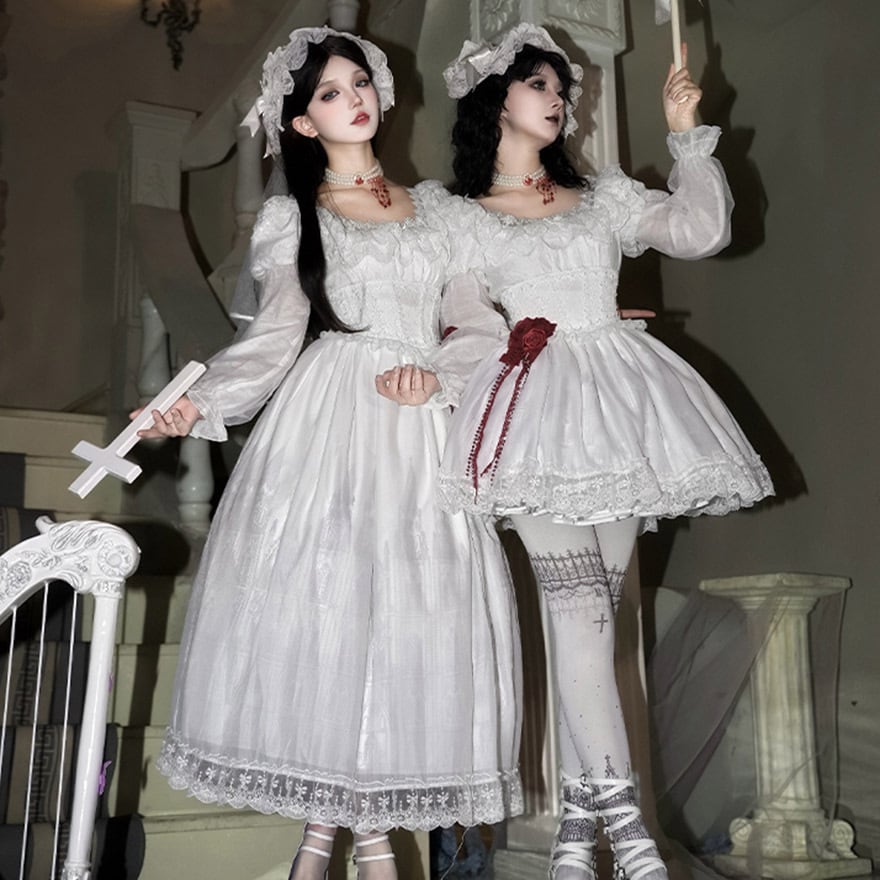 純白を基調とした、儚くも美しいゴシックロリータのロングワンピースセットです。