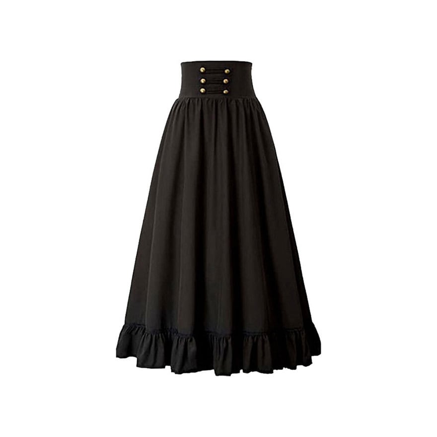 ハイウエストのデザインと、フロントにあしらわれたアンティークゴールドのボタンが特徴的な、クラシカルなロングスカートです。