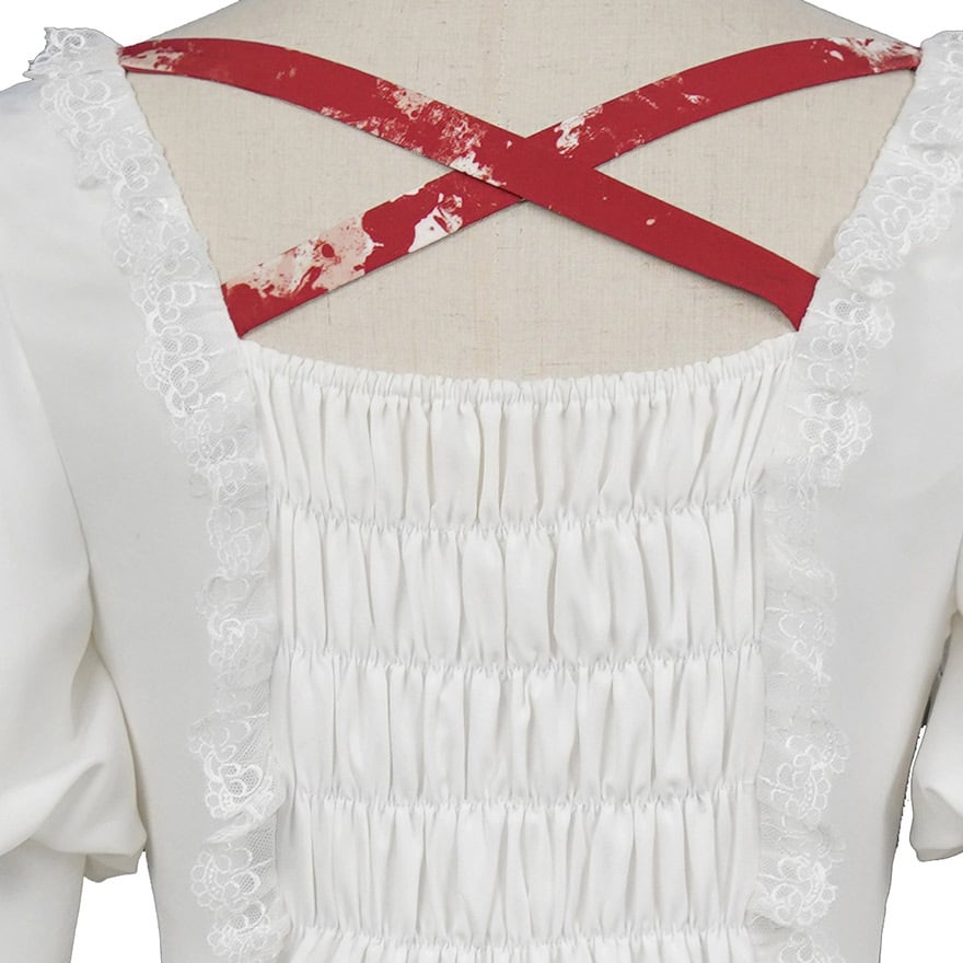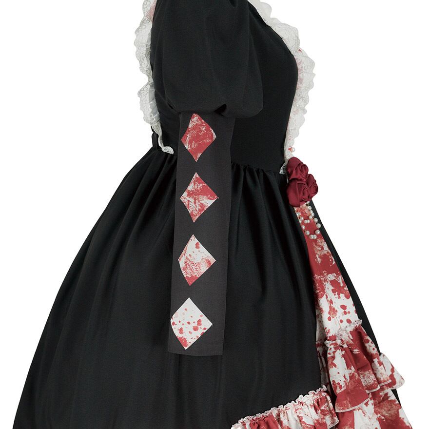漆黒の生地に、返り血を浴びたような鮮烈な血しぶき模様が映えるゴシックロリータドレスです。