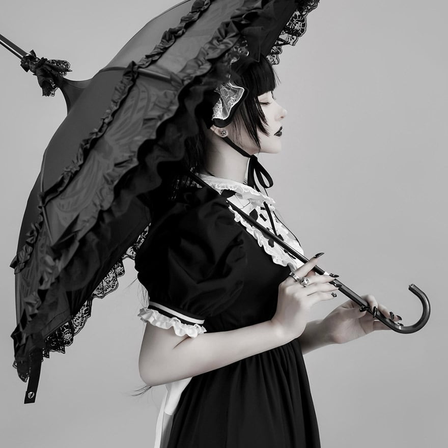 襟元や袖口、裾にあしらわれた純白のフリルが、ダークな雰囲気の中に可憐さをプラス。