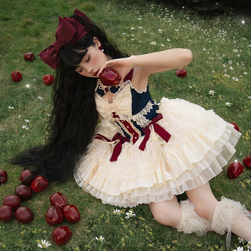 ジャンパースカートはコルセット風のデザインでウエストをきゅっと引き締め、幾重にも重なったフリルとレースが豪華に揺れるドーリーなシルエットを演出します。