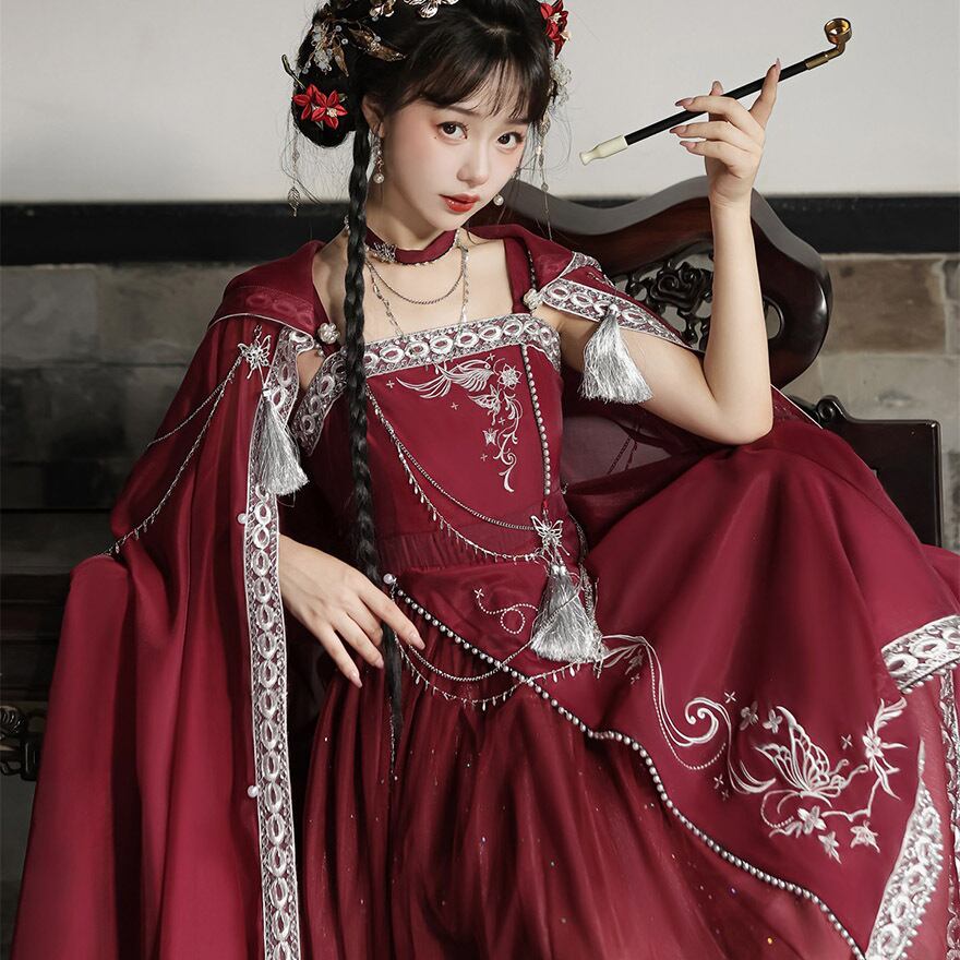 深い赤と落ち着いた青の2色展開の、優雅な中華ロリィタドレスです。