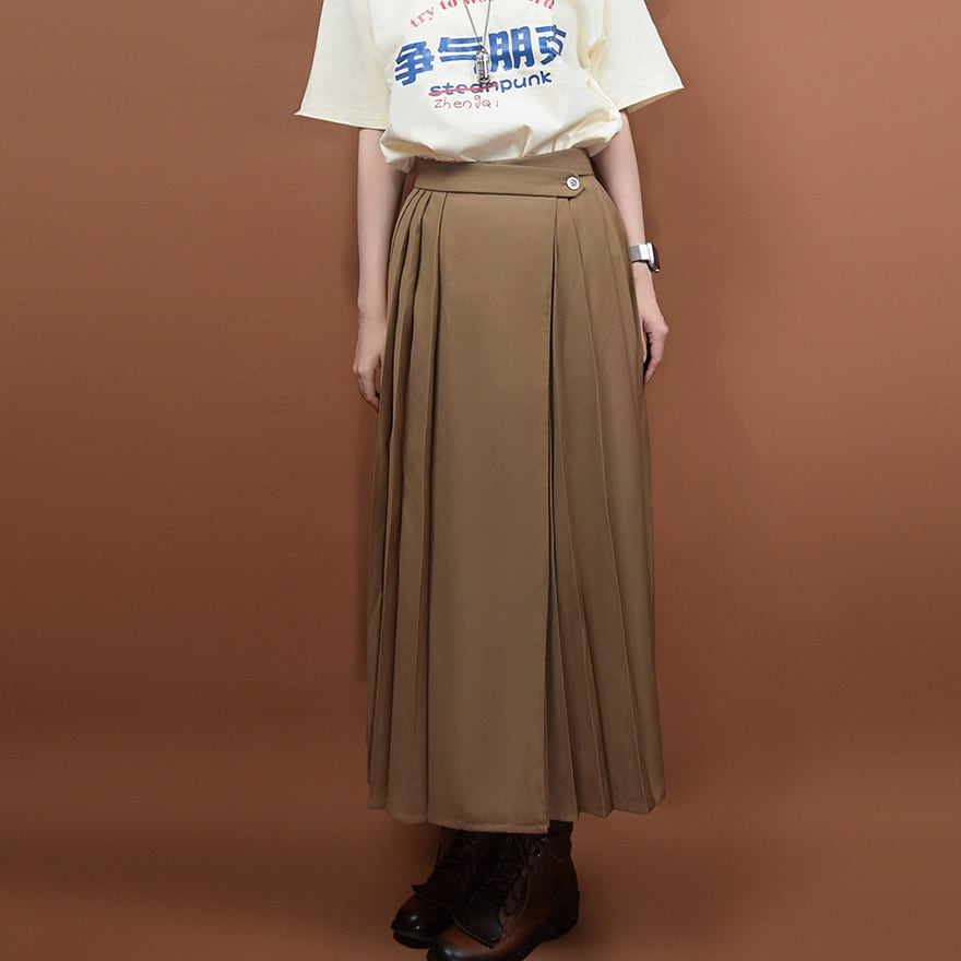 カーキ色の生地に、太めのプリーツが均等に施された、クラシカルで品のあるロングスカートです。