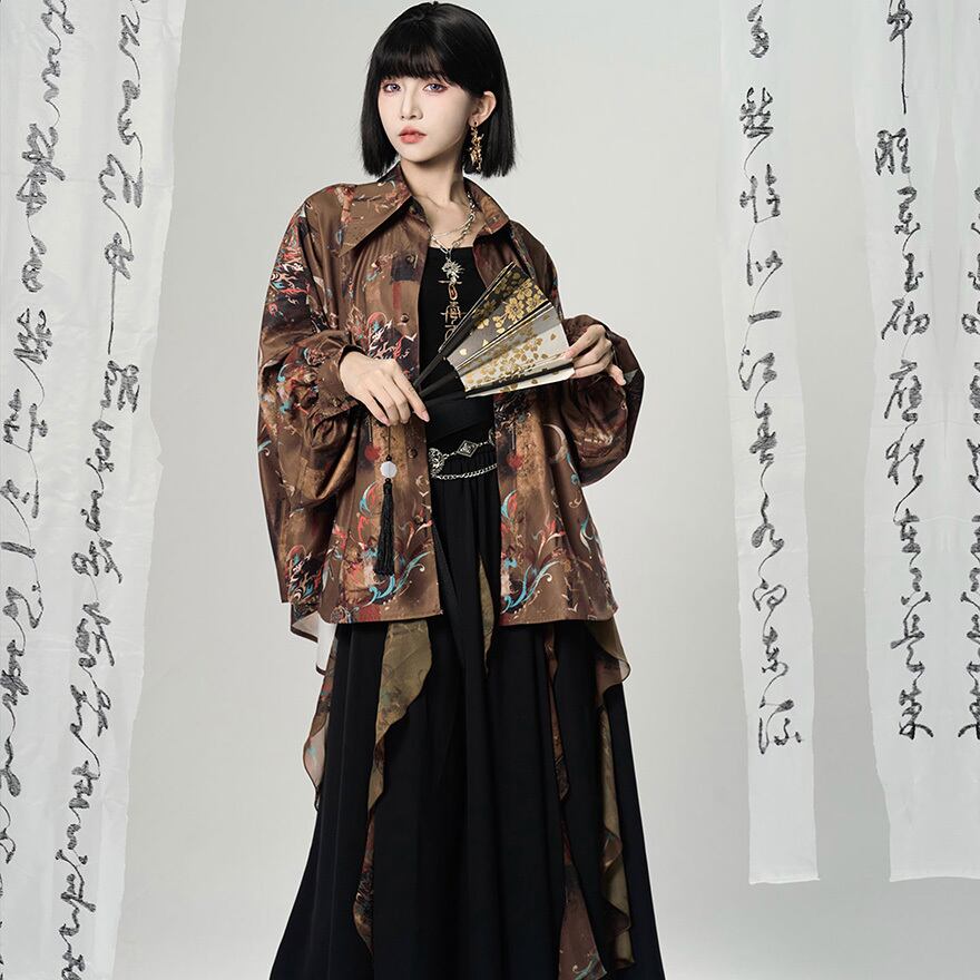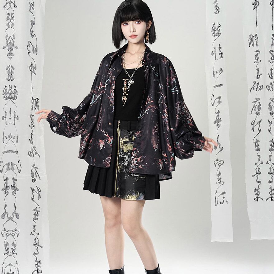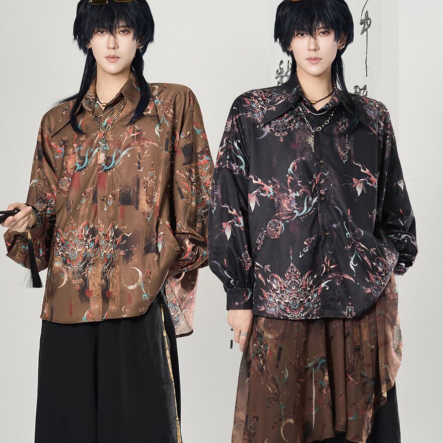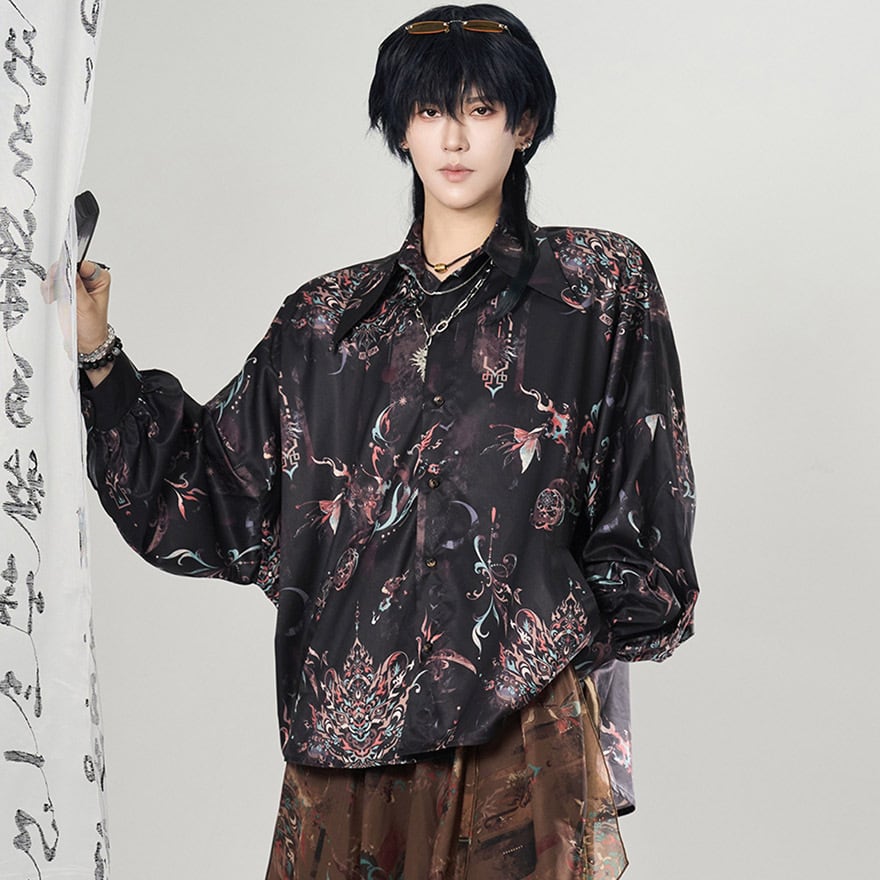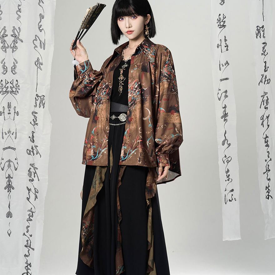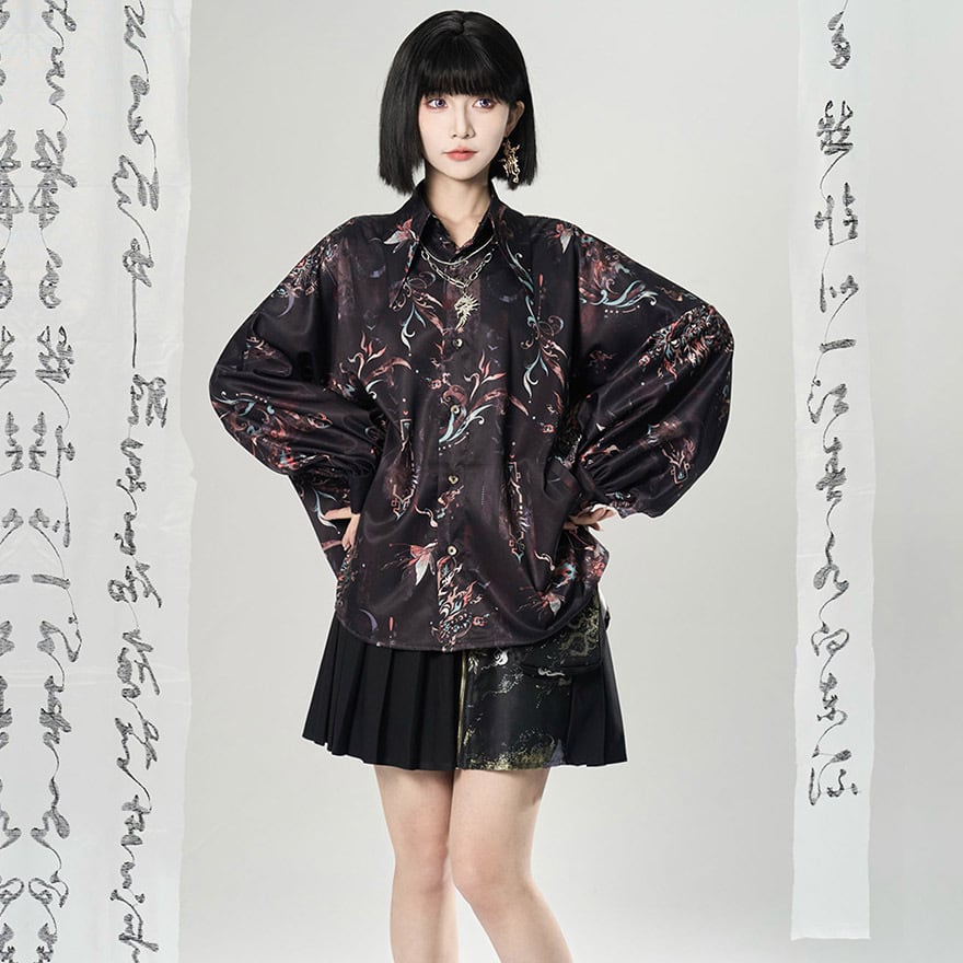 幻想的な東洋の絵画をそのまま閉じ込めたような、芸術的なプリントが全面に施されたオーバーサイズブラウスです。