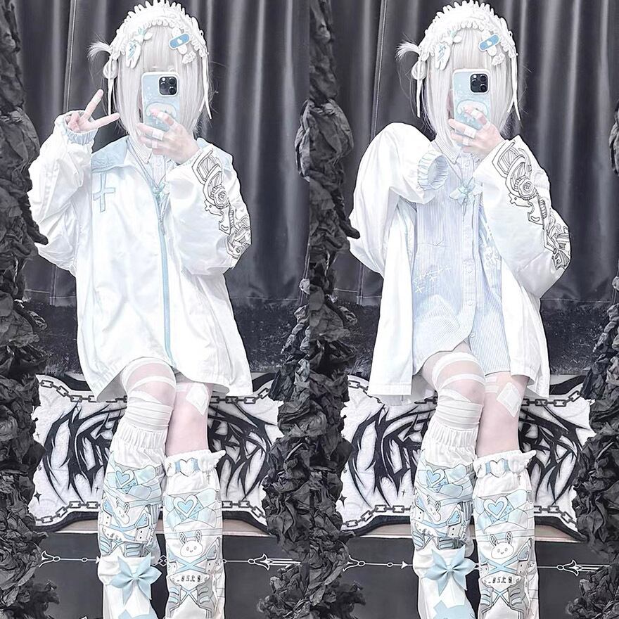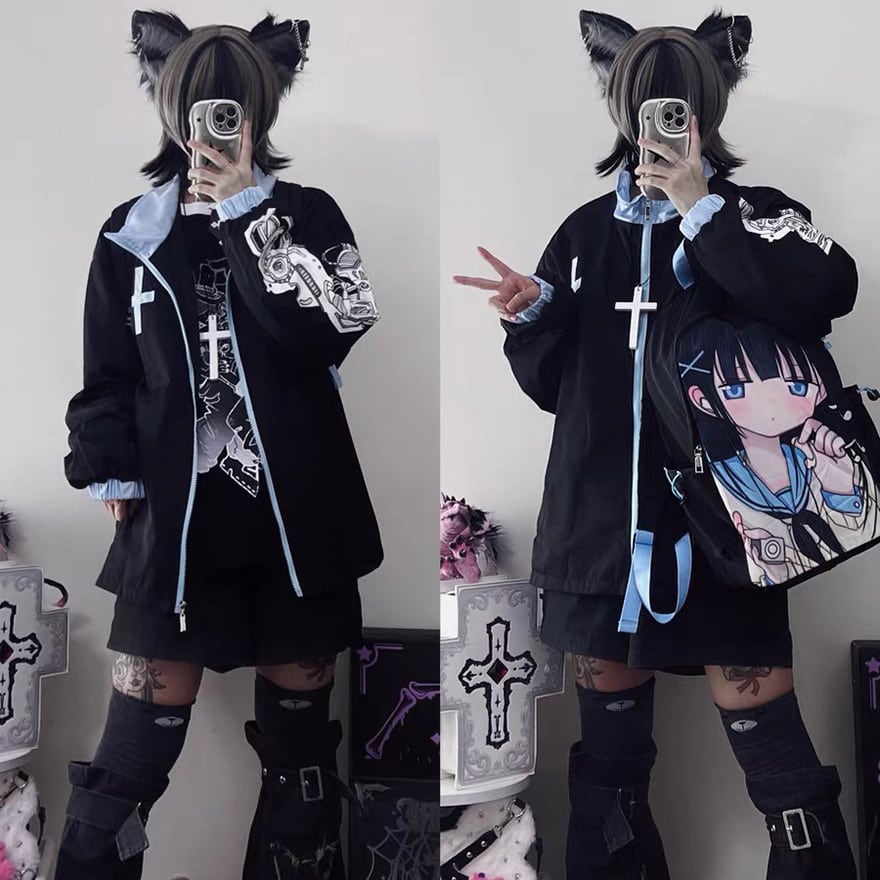 関連キーワード: #地雷系 #サブカル #天使界隈 #Y2K #ストリートファッション #原宿ファッション #ジャケット #アウター #十字架 #オーバーサイズ #参戦服 #双子コーデ