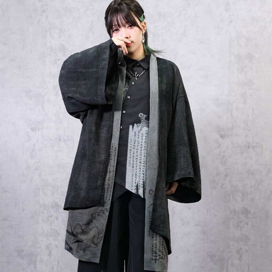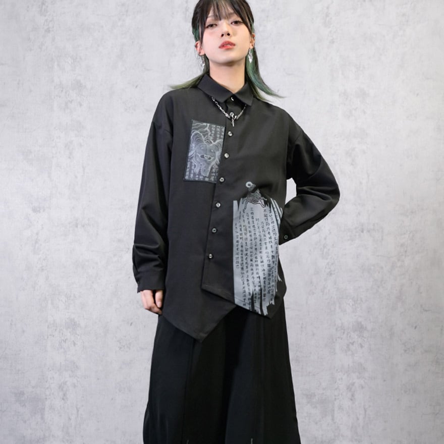 シックなブラックの生地に、水墨画のようなグラフィックと漢字プリントが大胆にあしらわれた、アシンメトリーデザインのシャツです。