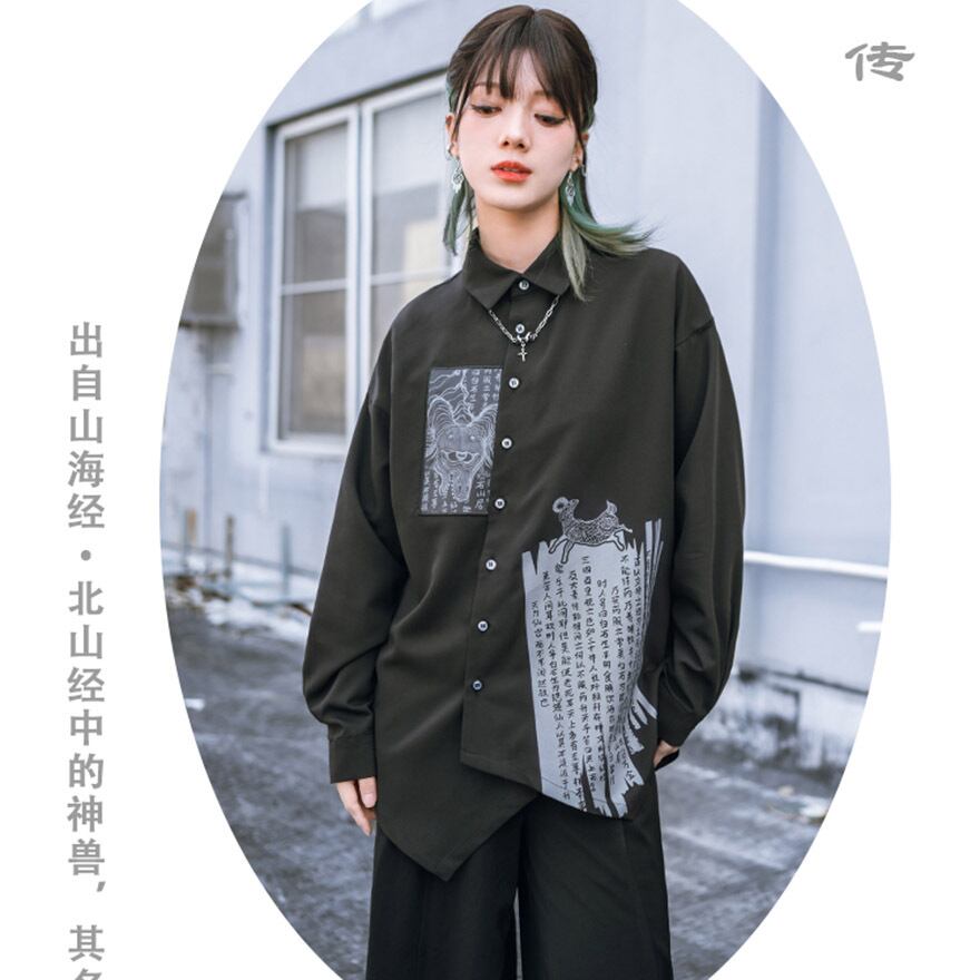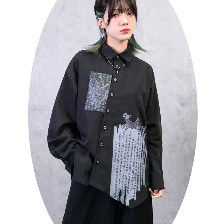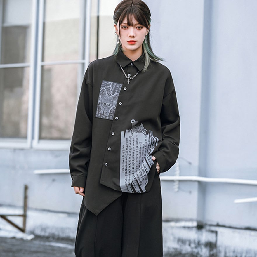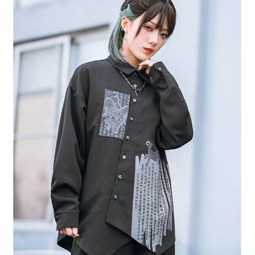 関連キーワード: #デザインシャツ #モード系 #ストリートファッション #サブカル #中華風 #アシンメトリー #漢字 #プリントシャツ #個性的 #ユニセックス #黒シャツ #オーバーサイズ