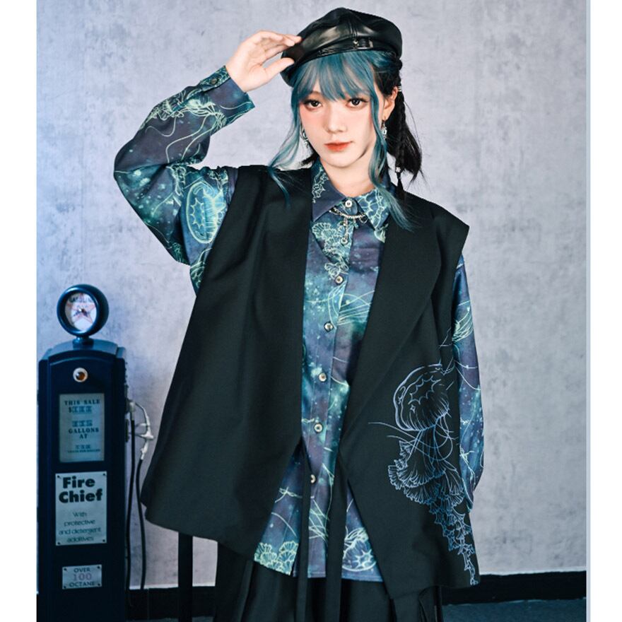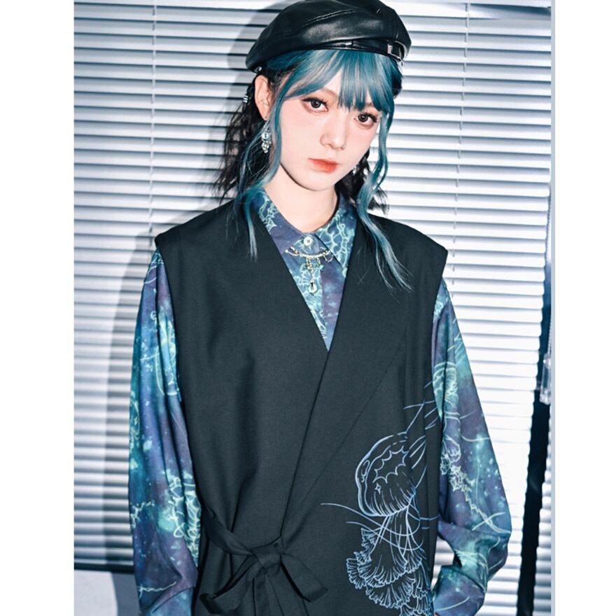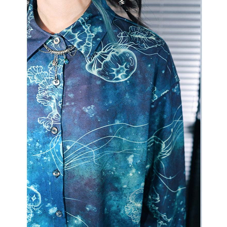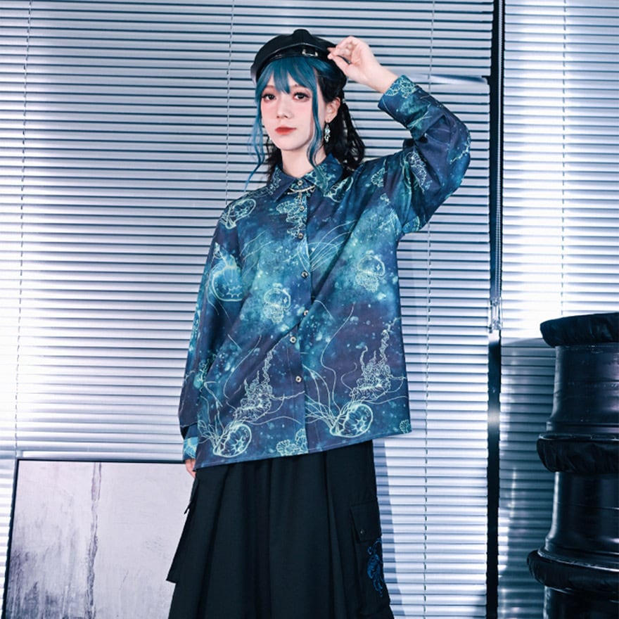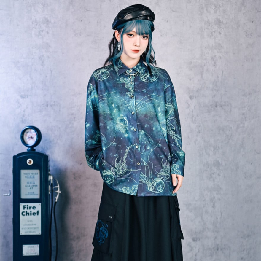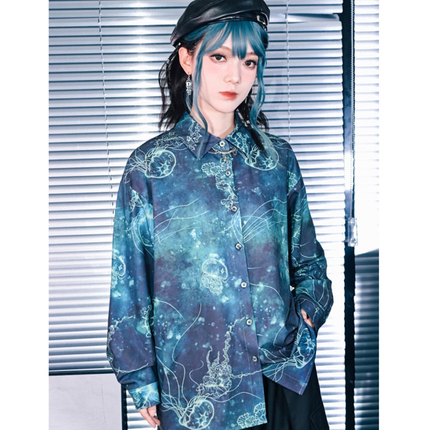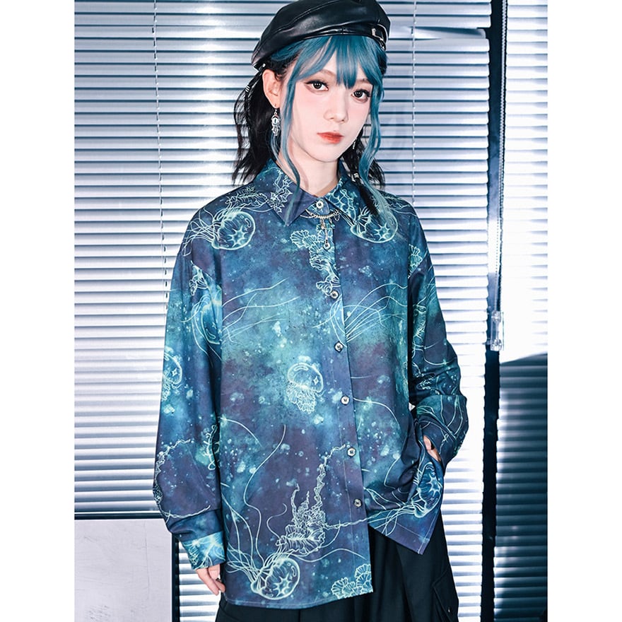 関連キーワード: #デザインシャツ #モード系 #ストリートファッション #サブカル #プリントシャツ #クラゲ #海月 #宇宙柄 #ギャラクシー #幻想的 #個性的 #ユニセックス #オーバーサイズ #アート #青文字系