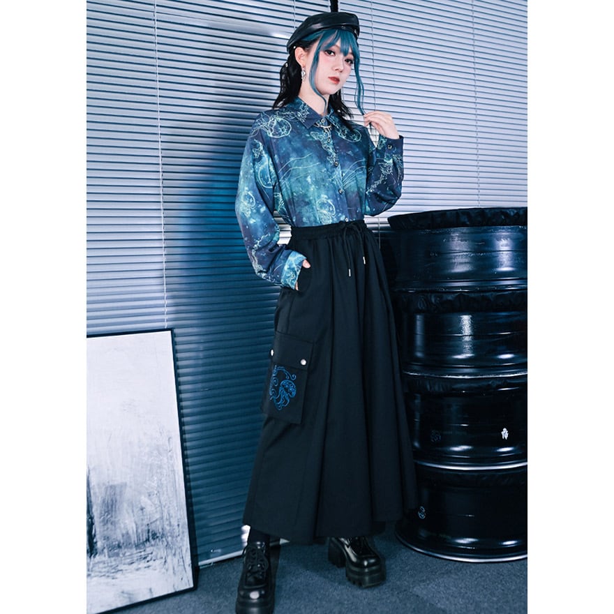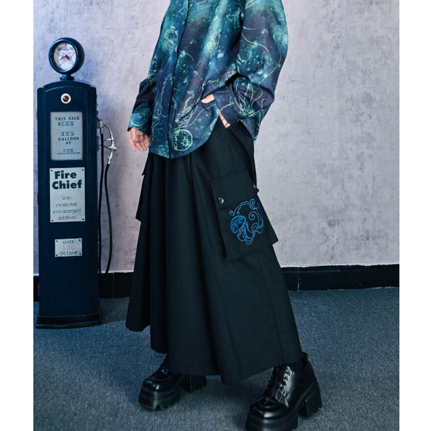 サイドには大きなカーゴポケットが配置され、片方には鮮やかなブルーで幻想的なクラゲのようなモチーフが刺繍されており、アシンメトリーなアクセントになっています。