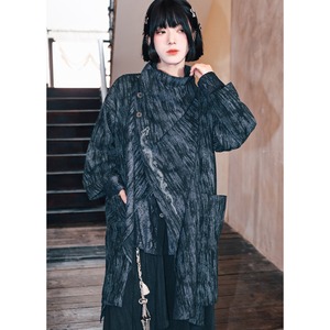 首元を覆うスタンドカラーと、斜めに配置されたアンティーク調のチャイナボタンが、独創的で洗練された印象を与えます。