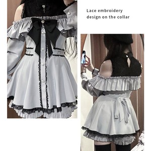 大胆なオープンショルダーが目を引く、地雷系のセットアップ風ワンピースです。