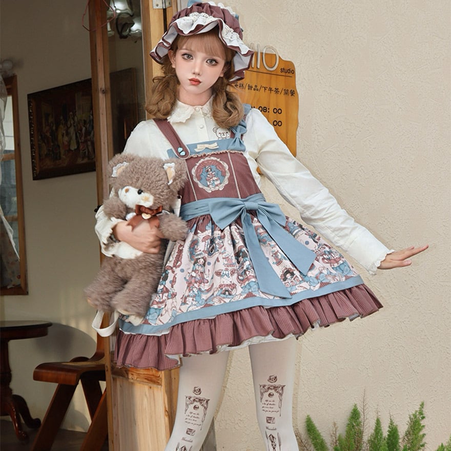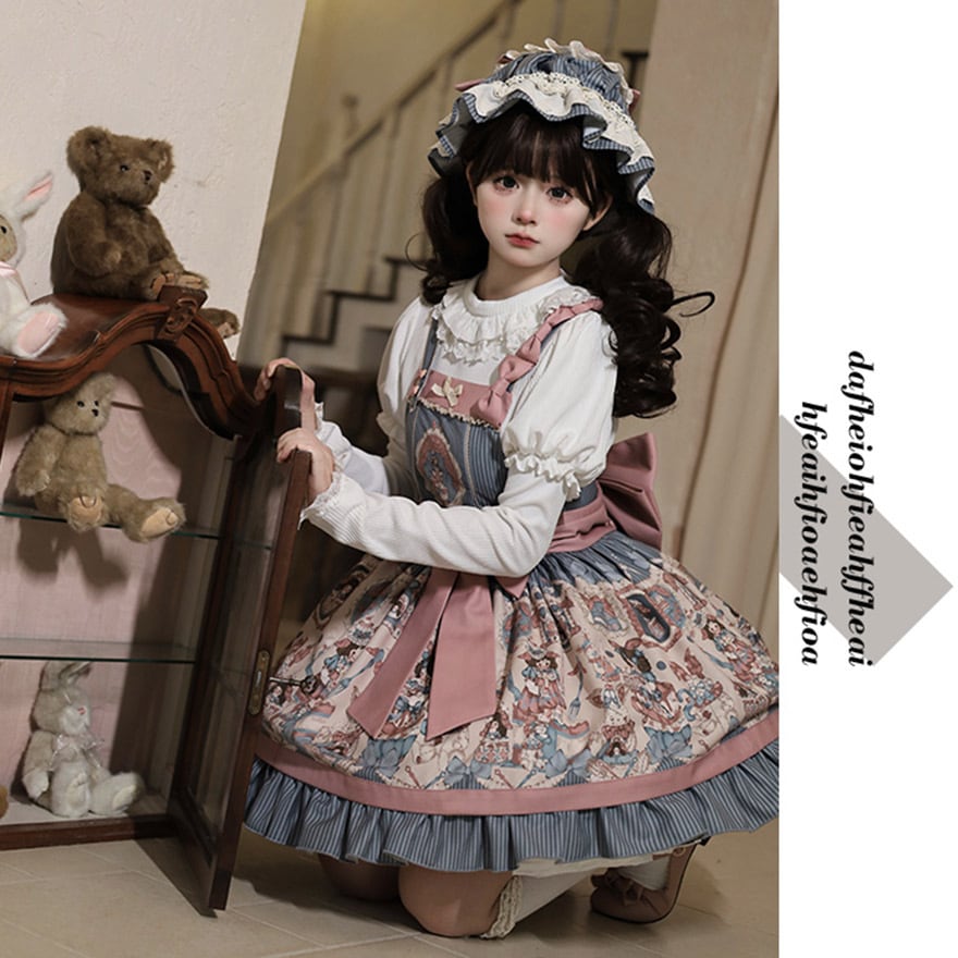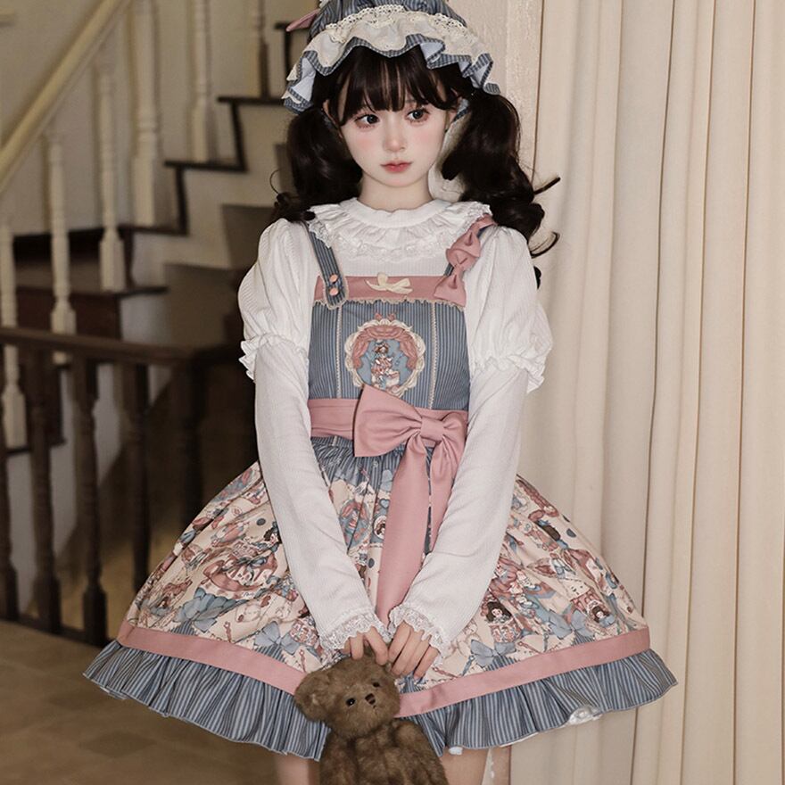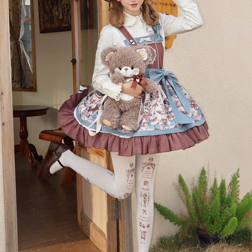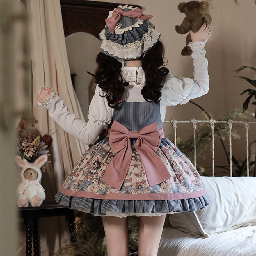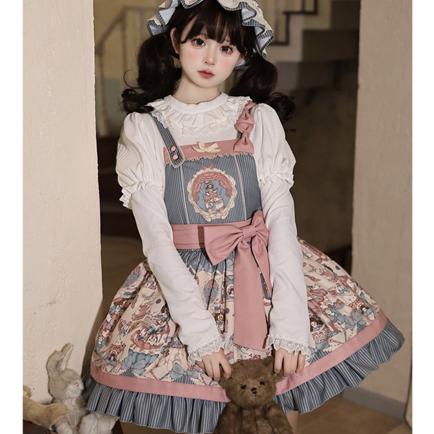 ロリィタ ALICE ジャンパースカート レトロ 甘ロリ ウエストリボン プリント柄