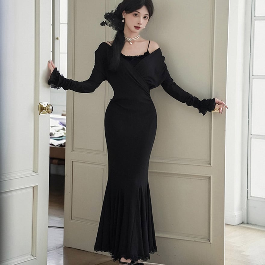 身体のラインを美しく見せるマーメイドシルエットが印象的な、黒のロングドレスセットです。
