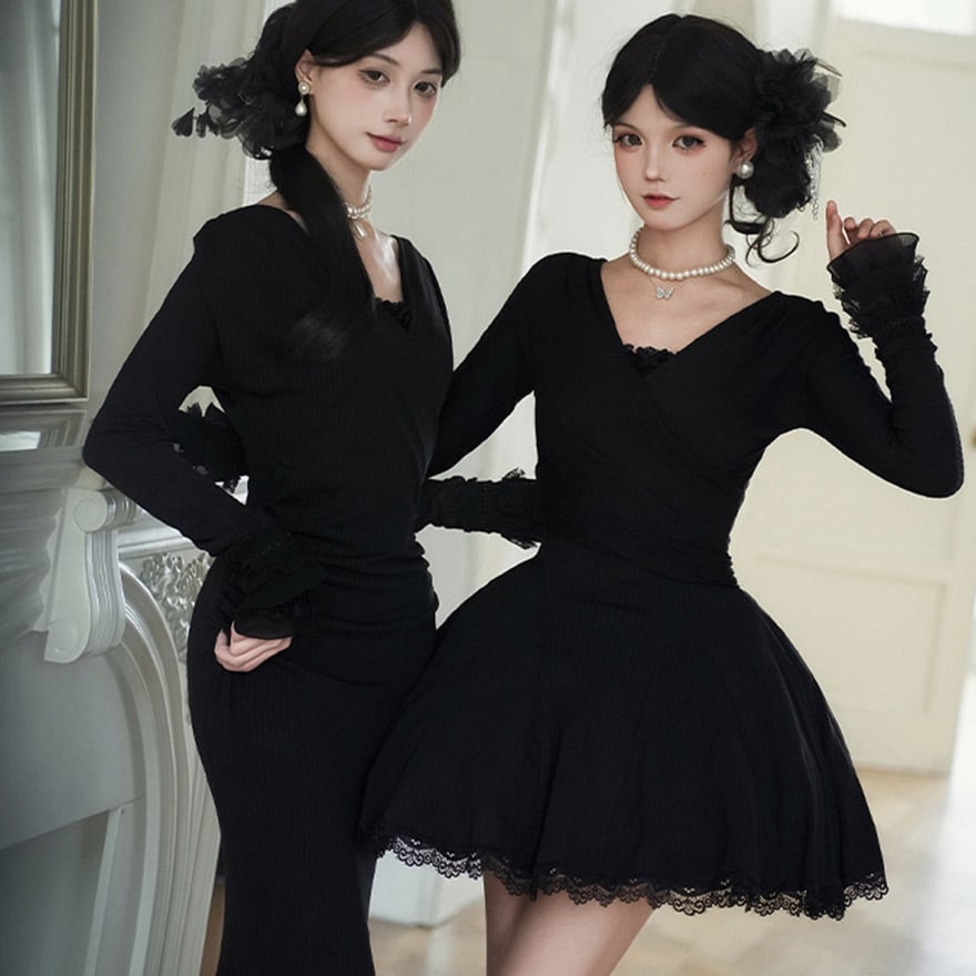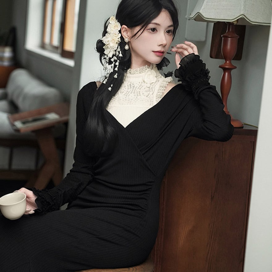 深く開いたカシュクールの胸元からは繊細なレースのインナーが覗き、上品な色香を演出します。袖口や裾にあしらわれたレースが、シックなデザインの中にさりげない甘さを添えています。