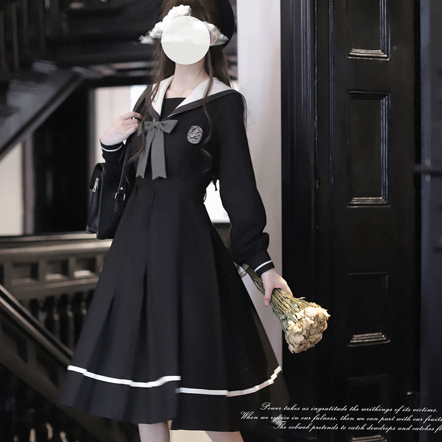 黒を基調とした生地に、清潔感のある白いセーラーカラーが映えるクラシカルなワンピースです。