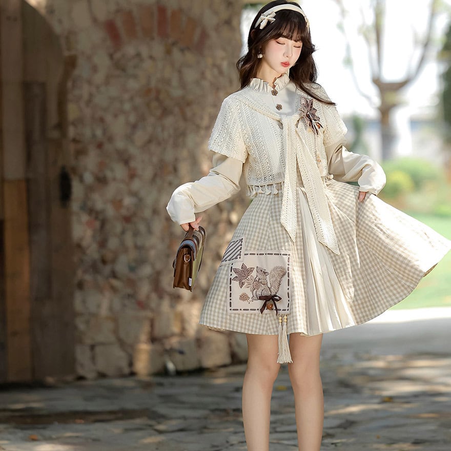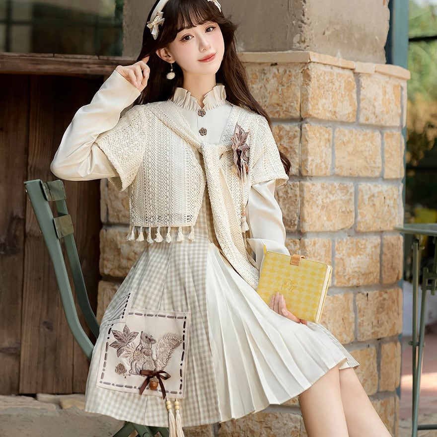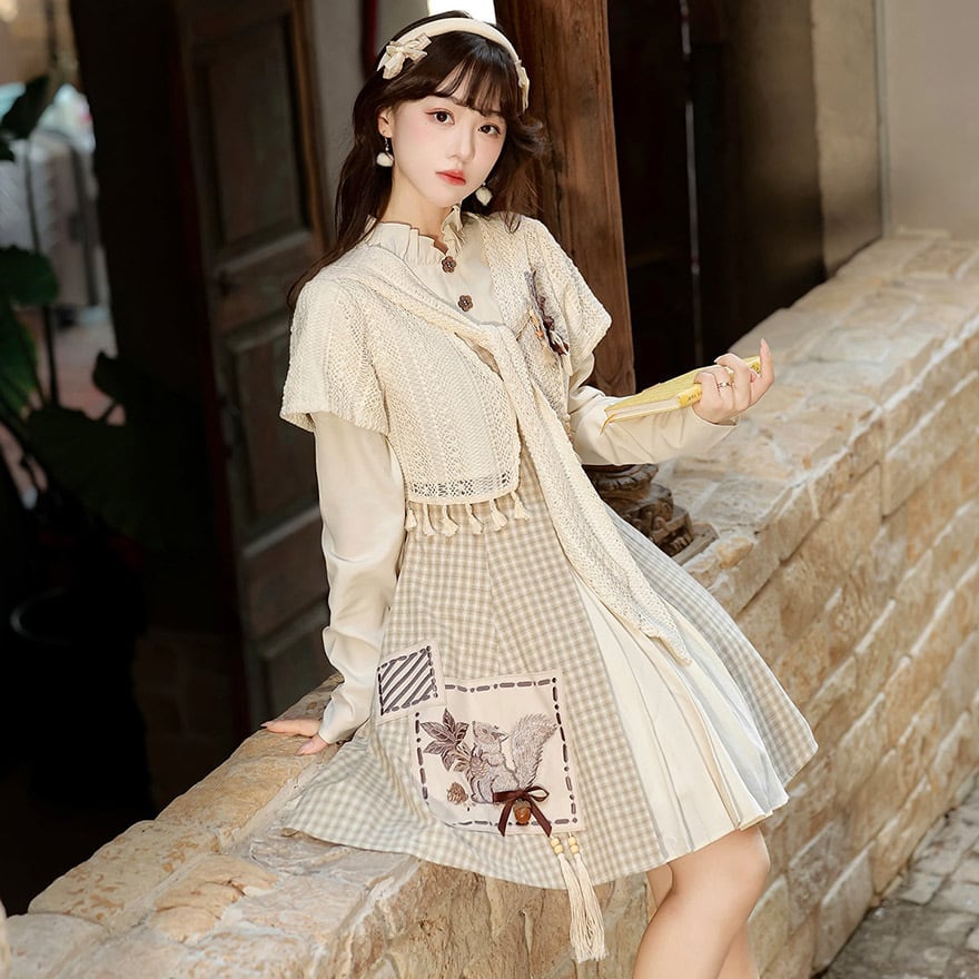 ワンピースのスカート部分には、愛らしいリスと木の実の刺繍が施されたポケットがアクセントになっています。