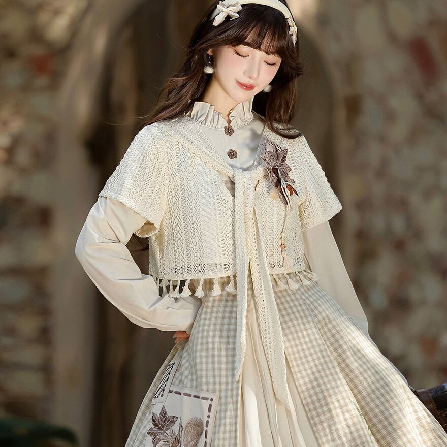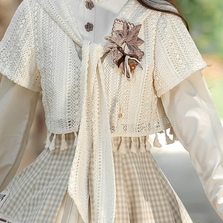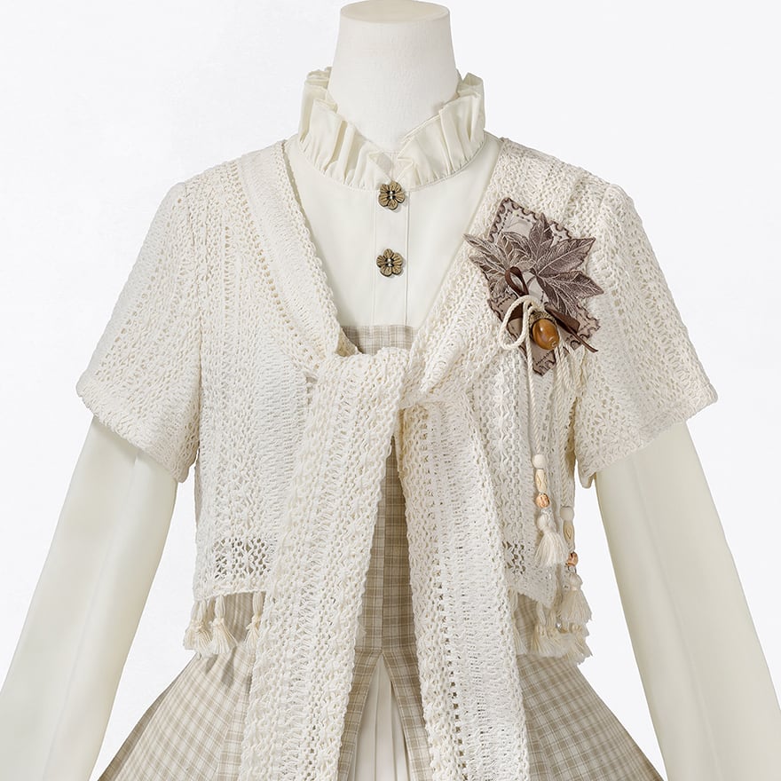 温かみのあるベージュのチェック柄ワンピースと、透かし編みがナチュラルなニットショールのセットアップです。