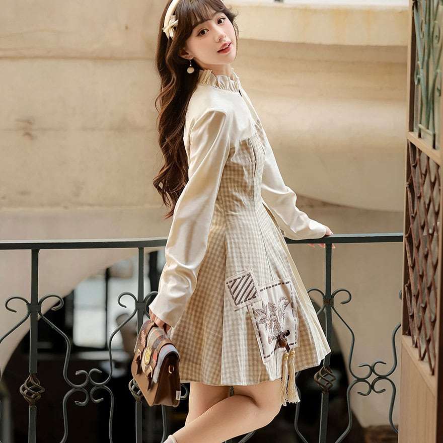 スタンドカラーのブラウス部分や、アシンメトリーなプリーツ切り替えが、クラシカルで上品な印象を与えます。