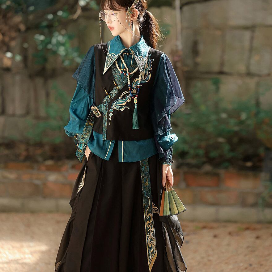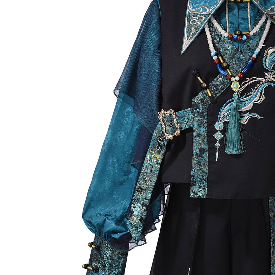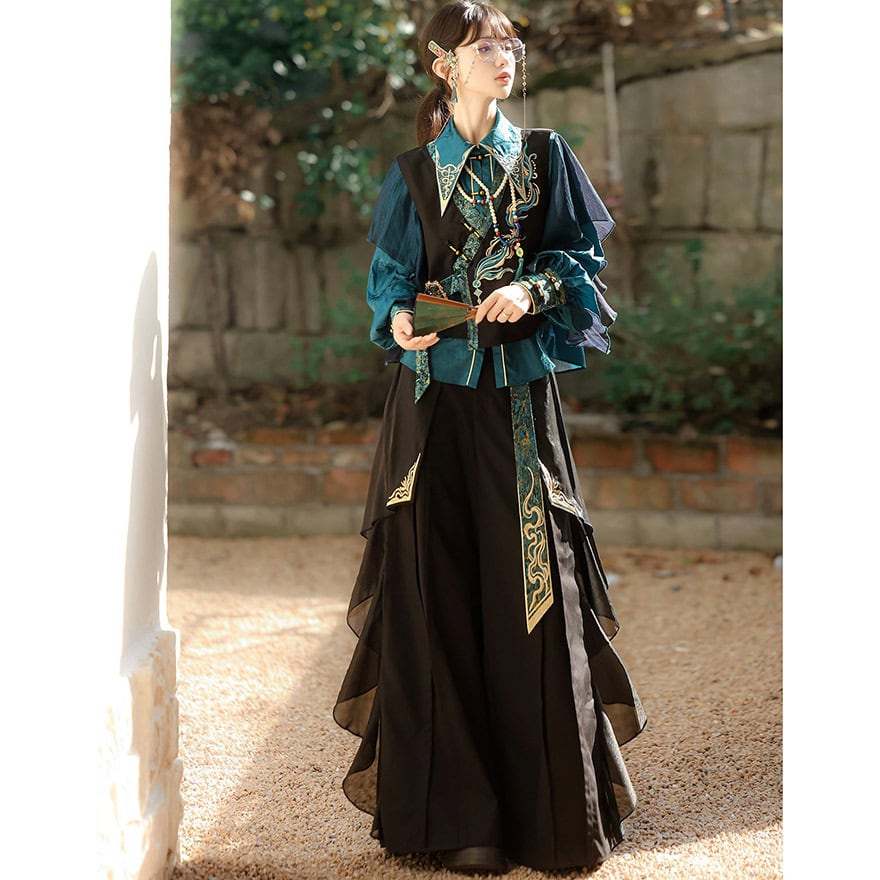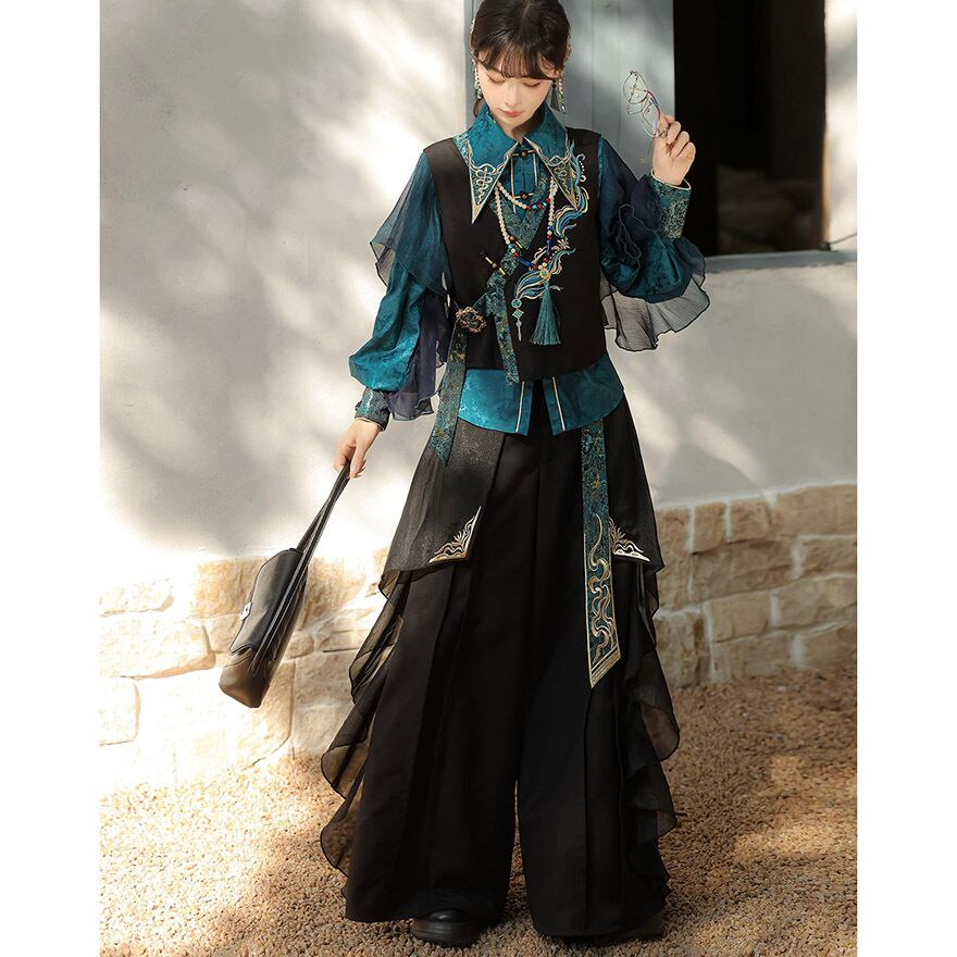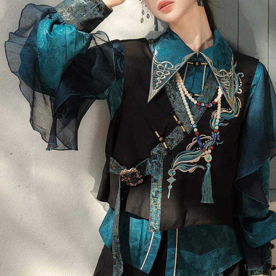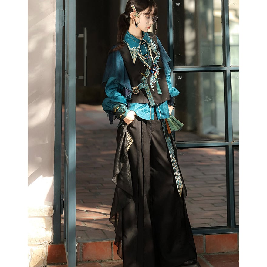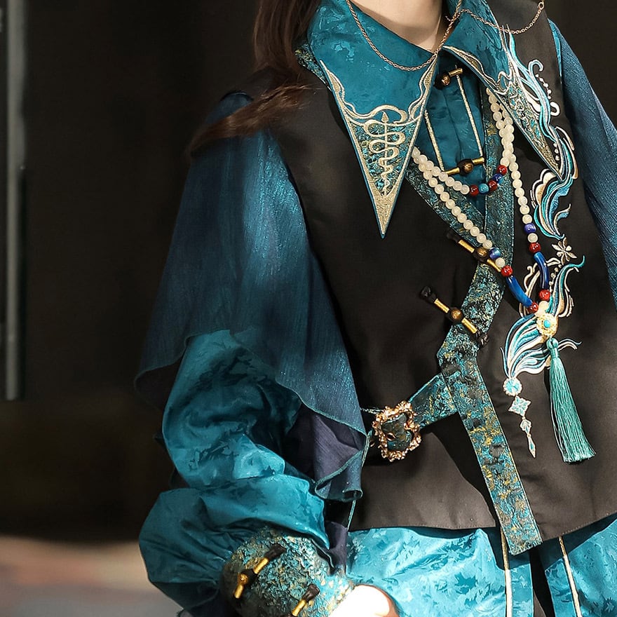 中華ロリィタ セットアップ ベスト バルモア襟 シャツ ターコイズカラー ワイドパンツ タッセル 4点セット イベント 撮影会衣装