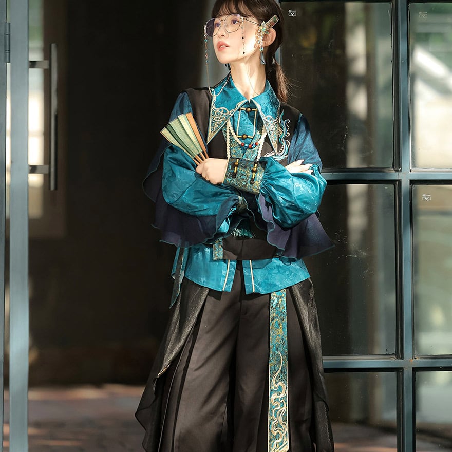深みのあるターコイズとブラックのコントラストが美しい、中華風デザインの4点セットアップです。