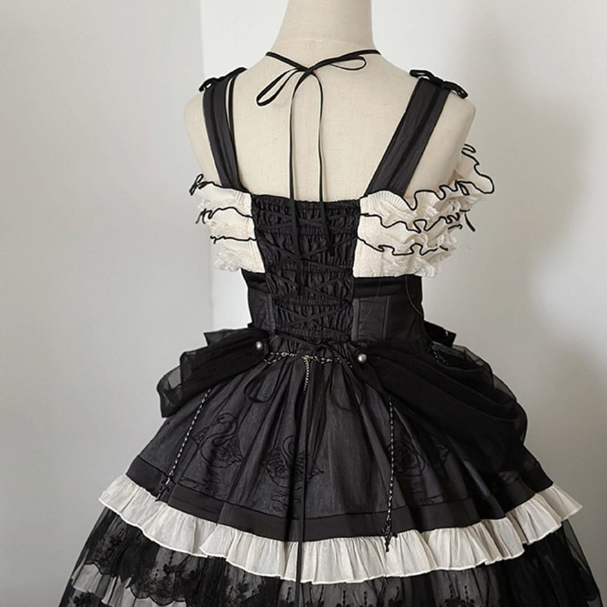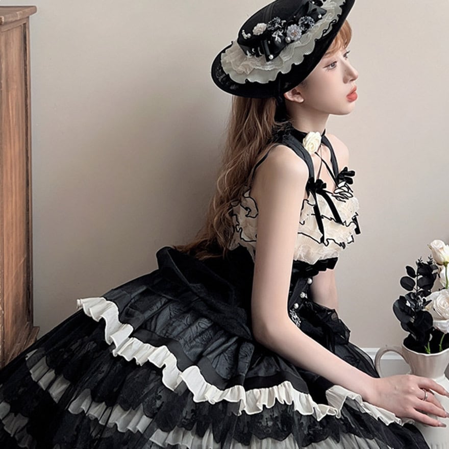 黒を基調とし、オフホワイトのフリルとレースをふんだんにあしらった、王道のゴシックロリィタドレスです。