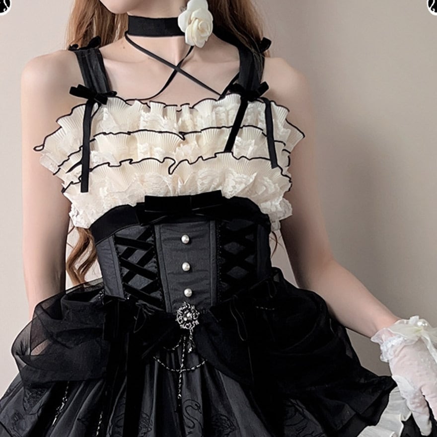 透け感のある黒いオーガンジーの下からのぞく白いフリルが、退廃的ながらも儚い美しさを演出。