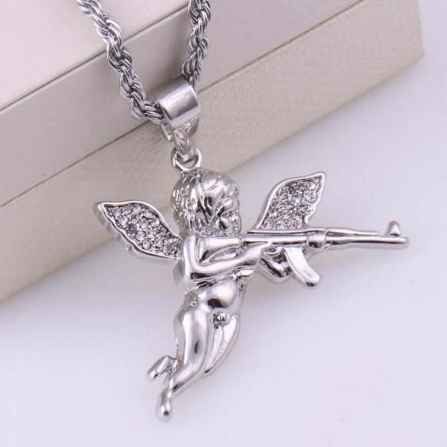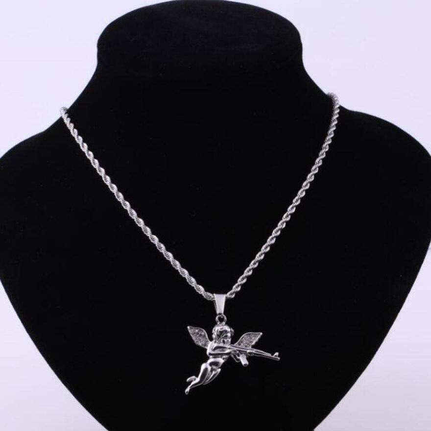 愛の象徴である天使(キューピッド)が、物騒なマシンガンを構えるという、皮肉とユーモアにあふれたモチーフのネックレスです。
