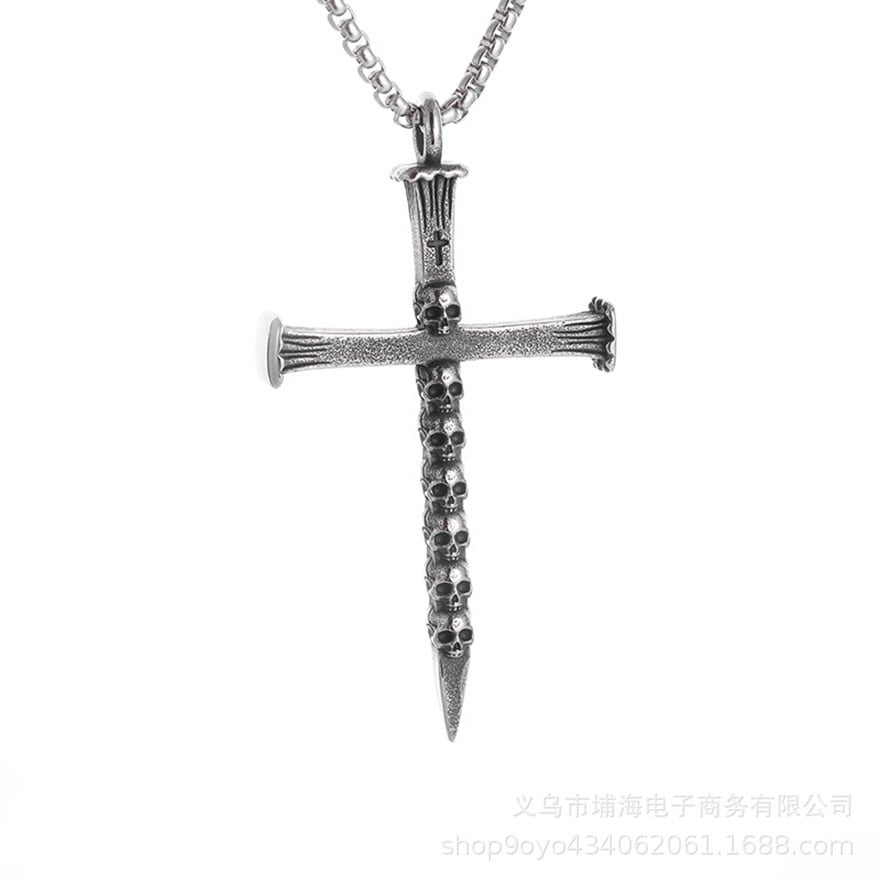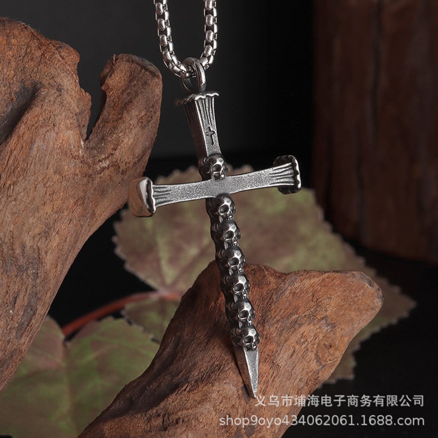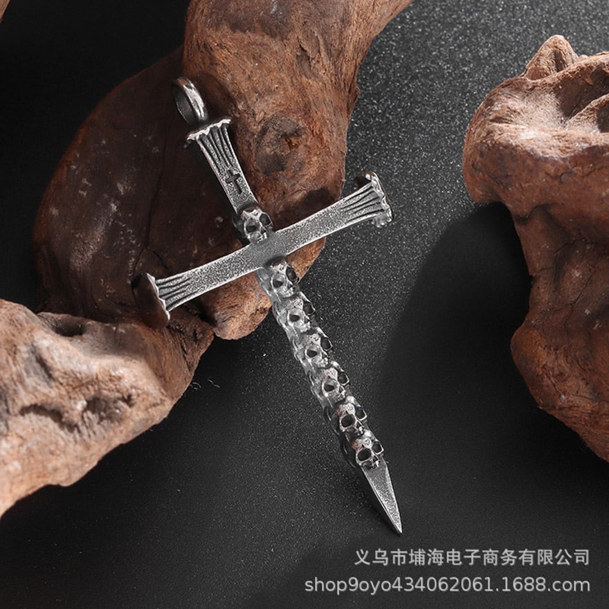 聖なるモチーフであるクロスに、死を象徴するスカルと無骨な釘を組み合わせた、冒涜的で美しいデザインが魅力。