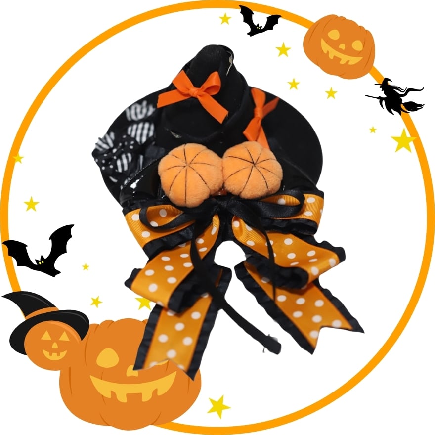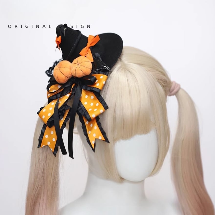 このヘアアクセサリーの魅力は、魔女の三角帽子のミステリアスな雰囲気と、パンプキンやリボンの持つ甘さが融合した、独創的なデザイン。