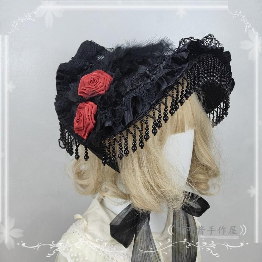 闇夜に咲き誇る、黒百合のロマン。ヴィンテージ感漂うゴシックなボンネットが、あなたのミステリアスな魅力を最大限に引き立てる。フェザーとレースが織りなす、退廃的で美しい存在感が、見る者の心を深く捉える。
