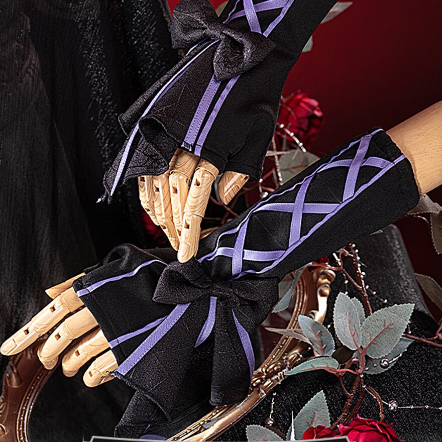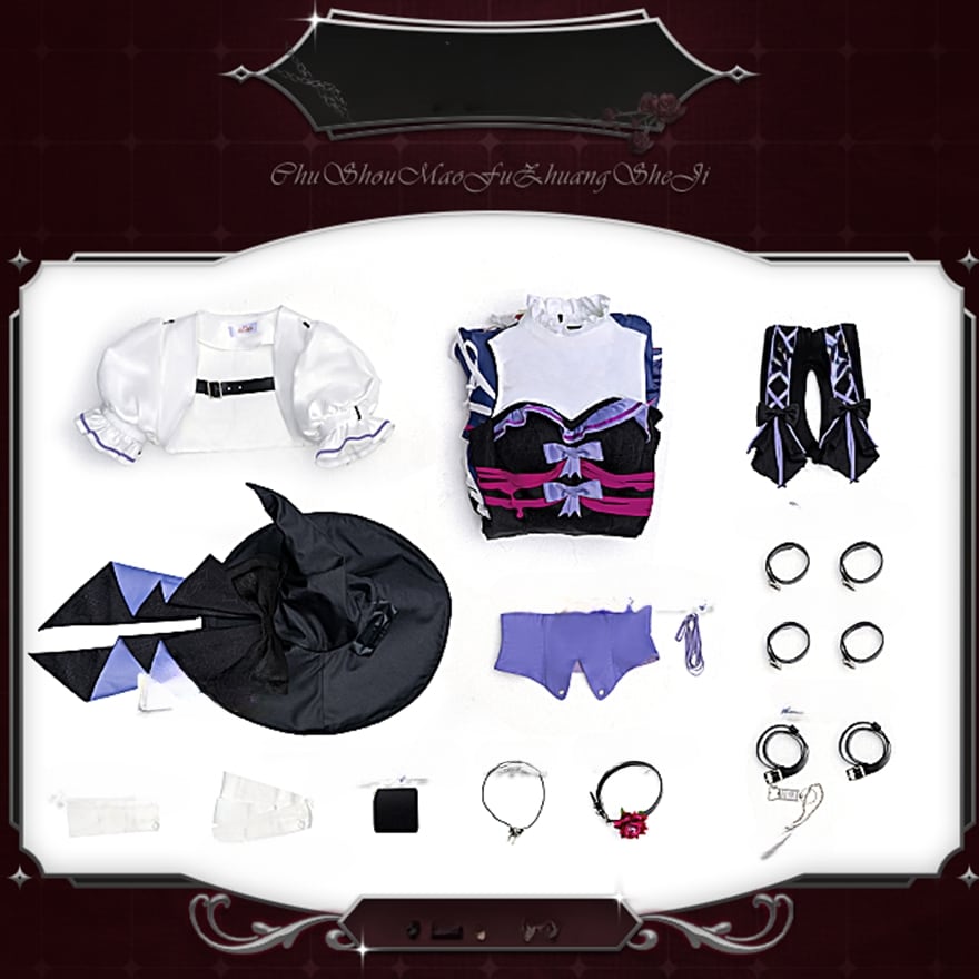 最大のポイントは、充実した9点のセット内容です。オールインワン本体に加えて、魔女の三角帽子、ヘッドドレス、手袋、ニーハイソックスなど、コーディネートに必要なアイテムが全て揃います。