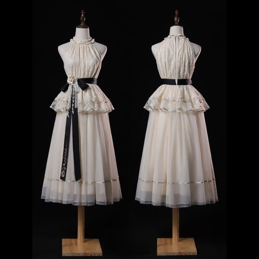 全体に施された繊細なレースとフリルが、可憐な雰囲気を演出します。首の後ろで結ぶホルターネックデザインが、デコルテラインを美しく見せ、洗練された印象を与えます。
