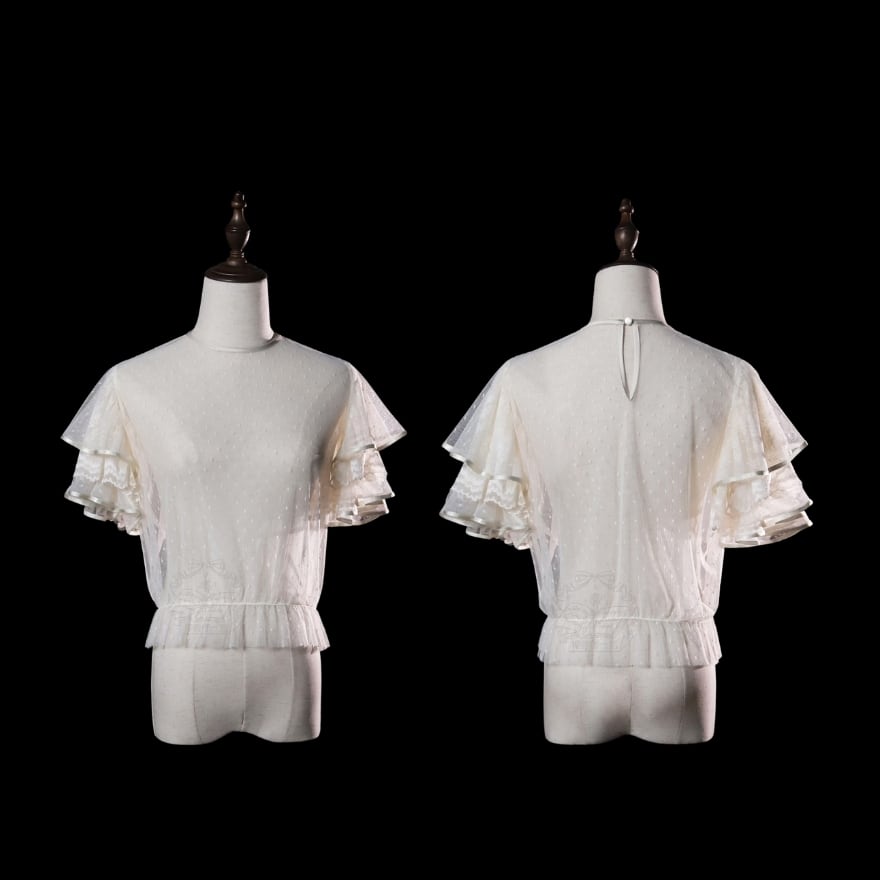 インナーとして、ブラウスやワンピースの下に重ね着することで、袖口や襟元からメッシュのフリルやドット柄がのぞき、コーディネートに奥行きとロマンチックな雰囲気を加えます。
